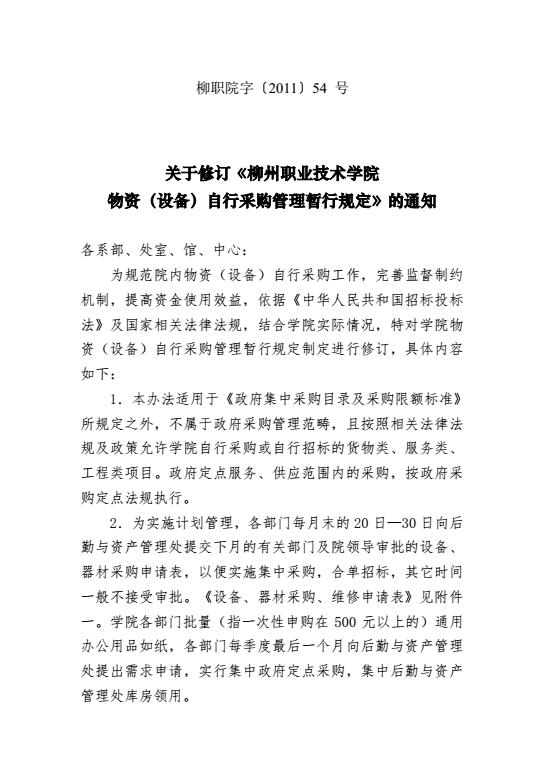 关于修订《柳州职业技术学院物资(设备)自行采购管理暂行规定》的通知 柳职院字【2011】54号 来源: 发布时间:2017-05-03 20:13:00 浏览次数: 次 【字体:小 大】 分享到: 【打印正文】