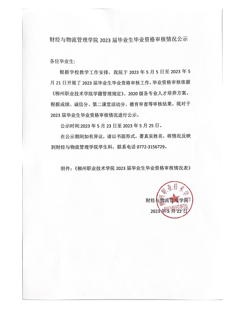 财经与物流管理学院2023届毕业生毕业资格审核情况公示