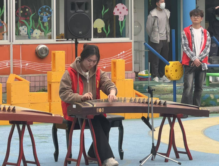 首先,音乐专业的学生为小朋友们演奏古筝曲目《秦桑曲》和《春到湘江》作为开场表演。小朋友们听得入神,不时报以热烈的掌声。