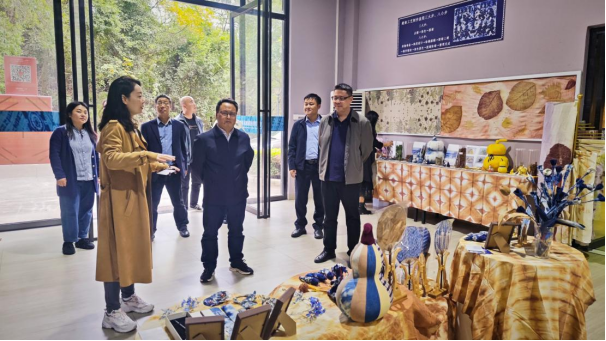 赵从奎副局长一行实地考察了艺术学院蜡染、扎染工艺坊及陶瓷艺术研发应用中心。在工艺坊内,赵副局长重点参观了植物染展区,深入了解学院基于“无废植染”理念打造的教学成果体系。展区通过数字化展示手段,系统呈现了以紫?;ㄒ丁㈤攀髌?、桑叶等本土植物及农作物废弃物为原料的植物染色体系。现场展出的丝巾、发簪、绣球等创新作品,展现了数字设计技术与传统染色工艺的深度融合。艺术学院作为柳州市植物染染色技艺?;さノ?,通过构建“数字设计+原料创新+产品研发”的完整教学实践链,推动传统工艺实现数字化创新,为乡村生态循环与文创产业发展探索了特色路径。