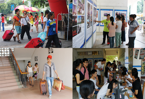 2013年9月14日,学院艺术校区洋溢着喜庆热闹的气氛,艺术设计系的师生们用真挚的热情和周到的服务喜迎近2013级新生的到来。 把校园装饰得像温暖的家艺术设计系师生们将艺术校区装饰一新,为2013级新生营造了一个富有艺术气息的“新家”。艺术设计系党总支梁毅书记亲自上阵,精心装扮校园的每一个角落,他干起了安装喷绘展板的“技术活”。校区四处张灯结彩,“艺术设计系——艺术的殿堂,设计师的摇篮,梦想从这里起航!”等欢迎横幅增添温馨。师生们还特意赶制了一批宣传栏,在学生作品展厅里展出了获得全国技能竞赛大奖的服装设计作品和包装设计样品、平面广告设计作品、装潢艺术设计效果图等,以图片、实物和宣传片多种形式向新生与家长们展示该系的专业特色和丰硕的办学成果。 新生和家长们走进校区,清新的活力和温暖的气氛迎面而来。 服务队中有一支先锋队艺术设计系组建了一支由115名学生会干部、班干和预备党员组成的服务队,担任迎接新生的任务,其中有一支由30名学生党员组成的先锋队,肩负起礼仪引导、搬运行李和咨询服务的重担,他们每天在校园里来回奔波数十趟,热心服务,不知疲倦,用自己的生活体验和学习感受,耐心解答新生们提出的各种问题。有的还充当起专业介绍讲解员和“职业规划指导师”,让新生更好地认识专业特点。先锋队在服务新生活动中展现出良好的综合素质,以高质量的服务获得新生与家长的喜爱和好评。 用热情换取真情在迎接新生时有这样温暖的场景:新生接待车一到校门口,青年志愿者服务队的成员们就微笑着迎上前,主动接过新生的行囊,从报道注册到衣食住行的每一个环节都做到细心关照、热情服务。 学生会主席张桂激情洋溢地说:“我们要像过年接亲戚一样把新生迎进来!” 从9月11日开始新生们陆续到校,9月13日服务队接待了20名提前到校的新生和家长,截止到9月14日正式接待日为止,共迎接了280名新生。艺术设计系今年有21名区外的新生,负责学生工作的老师提前和区外新生电话沟通,详细交代事项。来自四川的新生李仪感慨地说:“虽然这里没有我想象中漂亮的教室和宿舍,但是这里的同学和老师特别热情友好,主动关心我们,我很快喜欢上了这里。” (文、图/阎志斌)