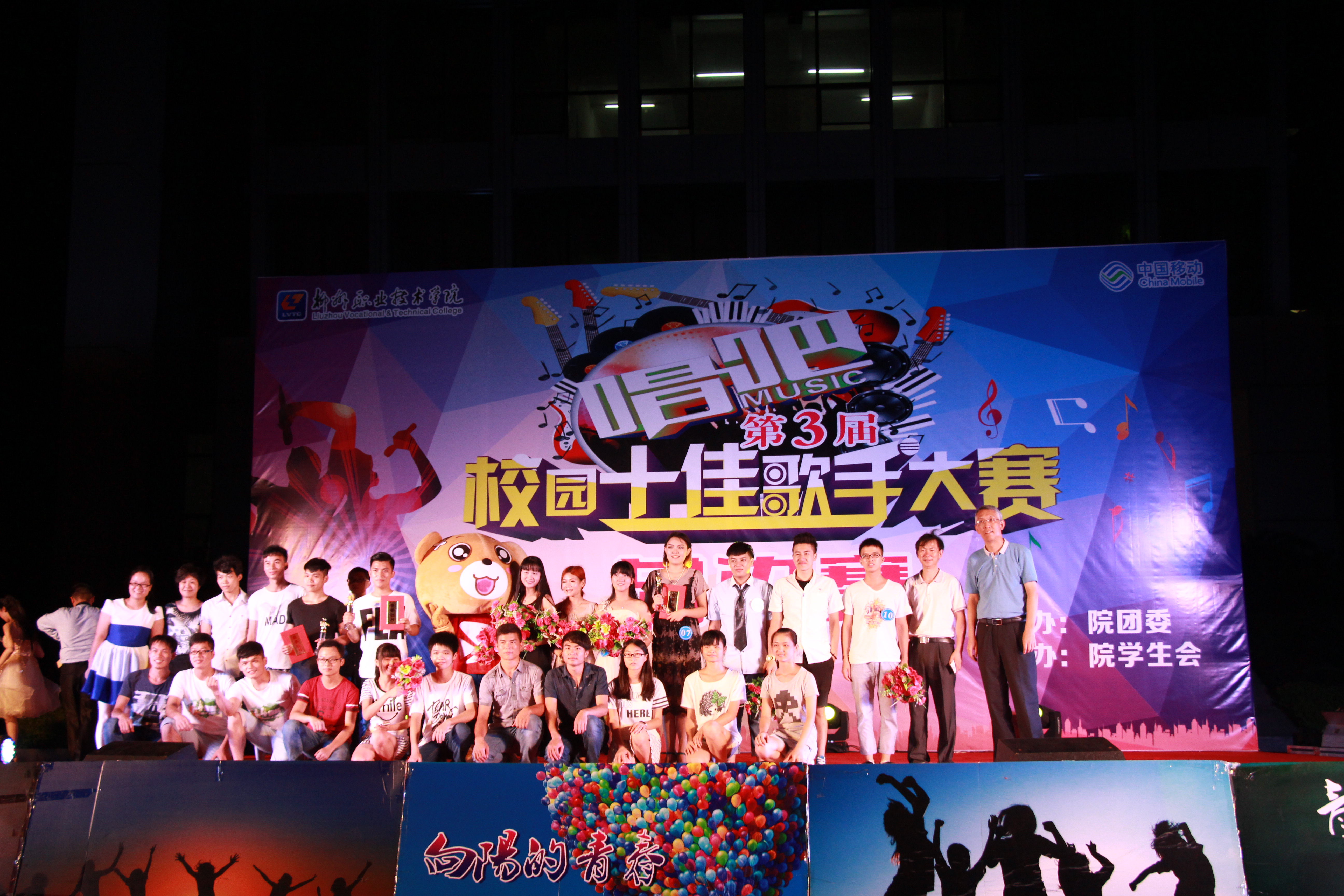 杨副院长为前三名选手颁发奖杯及荣誉证书。十佳歌手大赛继承着青春与梦想的光荣使命,以更为新颖、别具一格的方式向我们颂扬着青春的赞歌。历时4年,校园十佳歌手大赛已经举办了第三届,往后还会迎来第四届、第五届。在十佳的舞台上,我们看到了青春的自信,见证了向往自由的青春呐喊。十佳赛场上没有失败与成功,我们看到的是选手们为青春奋斗、拼搏的身影。一首首歌曲无不投射出他们在学院学习、生活的点点滴滴。承载着青春梦想的舞台不会落幕,校园十佳的舞台永远为柳职学子们打开。十佳歌手大赛只是同学们青春战场上的首秀,为同学们提供了展示才华的广阔平台,激发了同学们的青春活力,有利于培养同学们的艺术修养和道德情操。同时,也终将进一步繁荣我院校园文化生活,营造积极向上、健康文明的校园文化氛围。