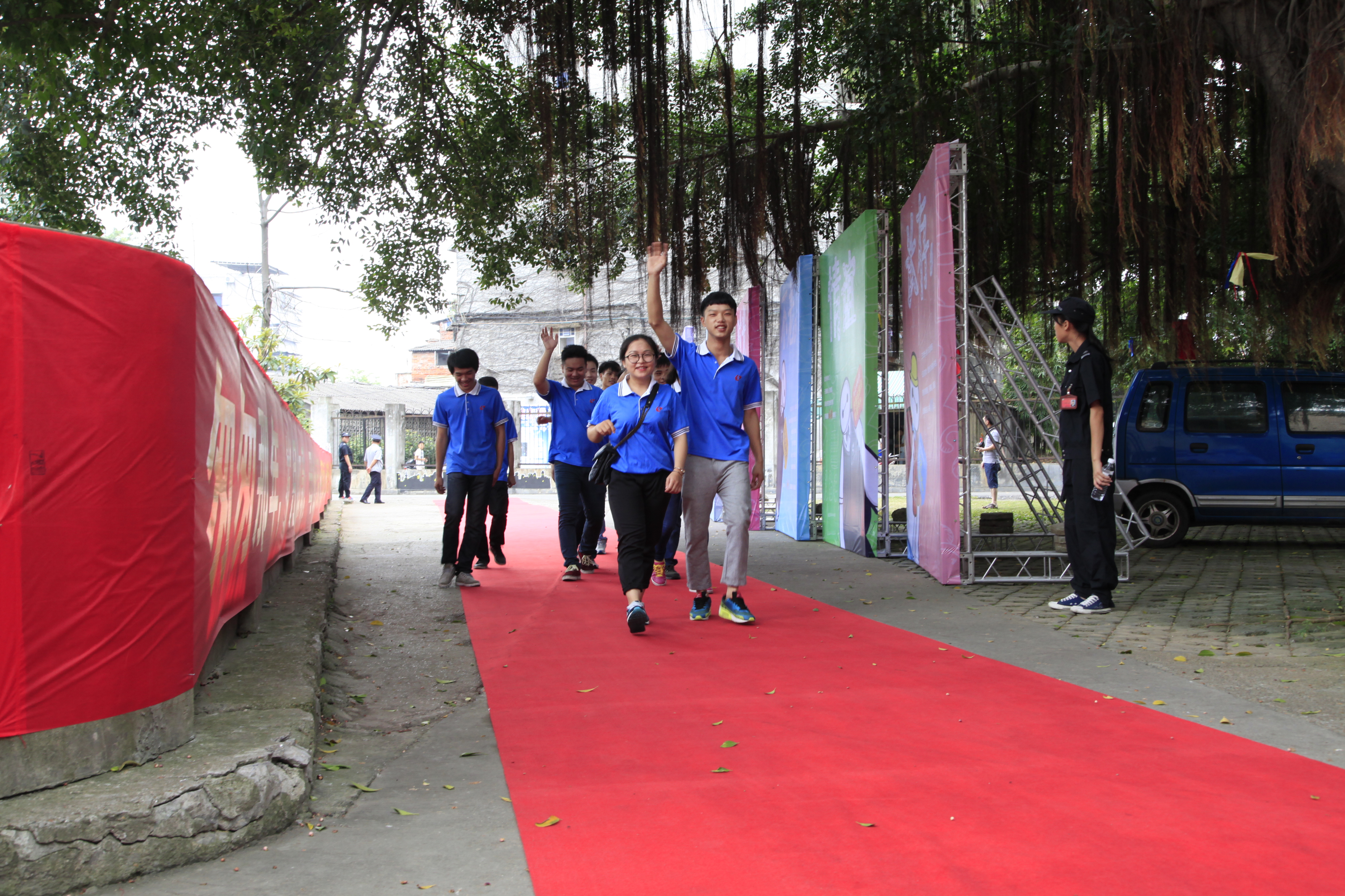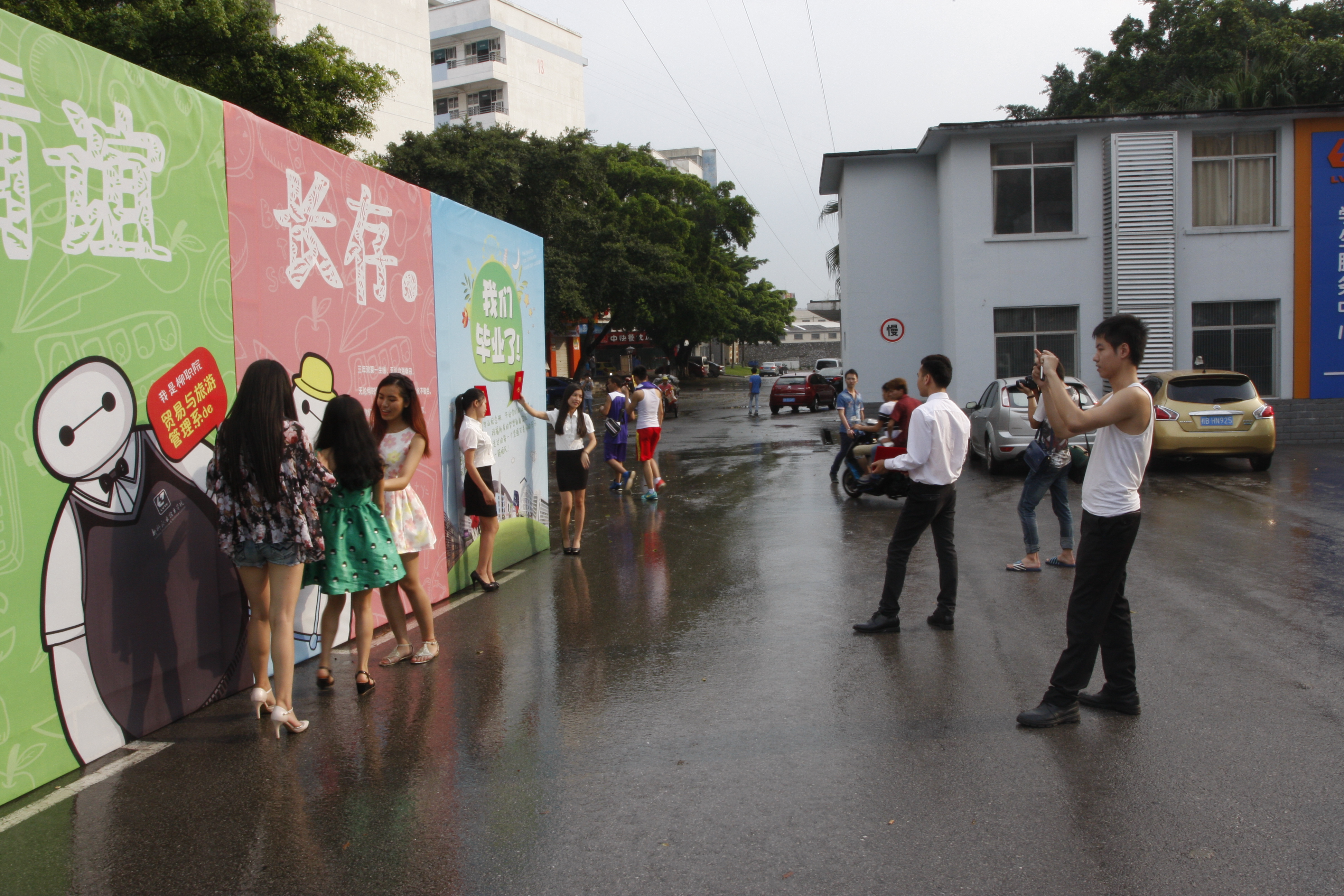 一进南校区大门,一幅巨型喷绘上 “我们毕业了!”几个大字不由分说地映入眼帘?;嫔弦涣V肿悠诖牌仆练⒀俊⒖ń峁?。种子上方有房子、有星星、月亮和太阳,喻示着毕业生们结束学业迈向锦绣前程。种子下方是柳职院的代表性建筑,意味着柳职院是毕业生们的坚强后盾和家。校道左侧,三条红色横幅一溜烟排过去,分别写着“今天桃李芬芳学子闯天下,明日社会栋梁母校侯佳音?!薄澳感S涝妒悄愕募?,记得?;丶铱纯??!薄敖拿髁舾感?,将感激留给老师,将关心留给同学,将信心留给自己。”一句句,一声声,都传递着不舍的离情。既有学校的期待,又有老师的叮咛,更有互相的鼓励。 接近礼堂时,代表7个教学系部的七色憨态可掬的“大白”带着萌萌的表情向人们致意,一句“不管你走到哪里,这里永远是你们的家”仿佛家人的叮咛。然后红毯从离礼堂台阶50米开外的距离一直铺展到礼堂内。毕业生们远远地从红毯走过来,宛如影星在奥斯卡颁奖典礼上挥手亮相的体验,喜庆而志得意满——这也是此次盛典的亮点之一 喻意着“桃李满天下”的毕业门,缀满了粉红色的桃花和洁白如玉的李花,甜蜜、温馨而浪漫。毕业门左侧是由1700余名毕业生剪影镶嵌成的巨型喷绘,配有文字“毕业了,期待再次相遇时,你已收获满园?!贝砹搜5南M屠鲜γ堑钠诖?。毕业门右侧是学生们平时学习、开展社团活动、实习及工作的一幅幅难忘的掠影。进了毕业门的左侧墙上,是2015年我院获得“自治区优秀毕业生”荣誉称号的35名毕业生的肖像。 沉浸在这样热烈而隆重、温馨而伤感的氛围渲染中,哪一种情绪被激发出来,都在意料之外,又在情理之中。