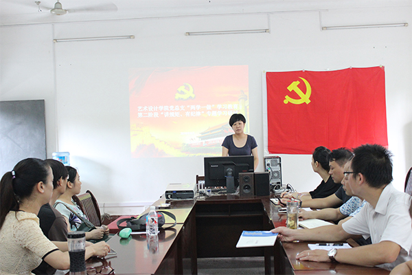 新闻网消息(艺术学院/白兰)7月1日下午,艺术设计学院党总支举办“两学一做”第二阶段学习研讨和迎“七一”庆祝建党95周年活动,党总支书记王慧主持,全体教工党员参加。 党总支部活动分为两个部分,首先由王书记做“两学一做”学习教育第二阶段“讲规矩、有纪律”专题讲座。她谈到,党的十八大以来,习近平总书记在系列重要讲话中多次提到“规矩”二字。在十八届中央纪委五次全会发表重要讲话时更强调,要加强纪律建设,把守纪律讲规矩摆在更加重要的位置。结合学院的实际情况,要求教职工们认清三个问题:一、什么是党的纪律和党的规矩;二、严守党的纪律和规矩是党的优良传统;三、作为一名高校教师,如何遵守政治规矩。要求全体教工党员,做到“时时讲规矩,永远守纪律”。
