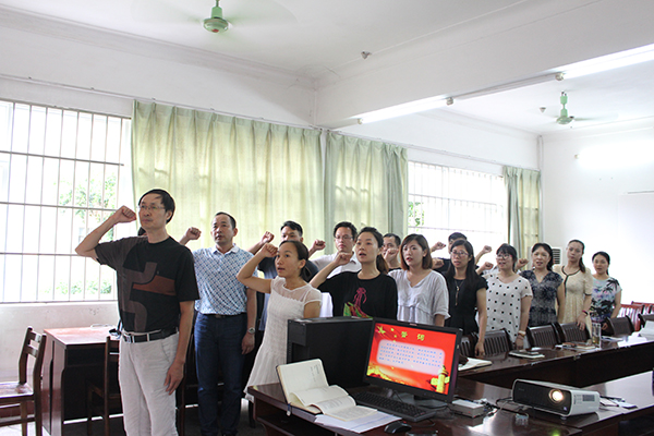 全体教工党员同志围绕这一主题进行研讨,剖析自身在实际工作生活中,在“规矩”和“纪律”中做得不到位的地方,纷纷表示,要好好地上好党员干部健康成长必修课,把握正确的前进方向,防范错误和风险,做一名优秀的共产党员。 支部活动第二阶活动是,为庆祝建党95周年,全体教工党员重温入党誓词:“我志愿加入中国共产党,拥护党的纲领,遵守党的章程……”在鲜红的党旗下,各位党员高举右手,在总支部党龄最长的老党员黄斌老师的领誓下庄严宣誓。全体党员深深感受到党员的责任、使命和荣耀,表示要在今后的工作中时刻以党员的标准严格要求自己,保持党员先进性,发挥优良传统,坚定理想信念,牢记职责使命。干在实处,走在前列,推动发展,以优秀的业绩向伟大的党献礼,践行对党的庄严承诺。