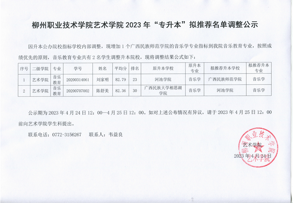 柳州职业技术学院艺术学院2023年“专升本”拟推荐名单调整公示