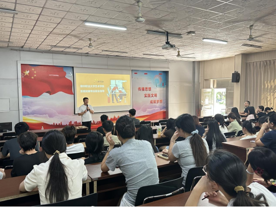 新闻网消息(文、图/艺术学院 白兰)为准确把握AI时代行业态势,提升大学生就业竞争力,2025年8月1日下午,艺术学院在社湾校区思贤楼101报告厅举办影视动画专业2026届毕业生就业指导讲座。本次讲座特邀广西聚禾数字传媒科技有限公司总经理向才桂担任主讲,2023级影视动画专业学生共110人参加。