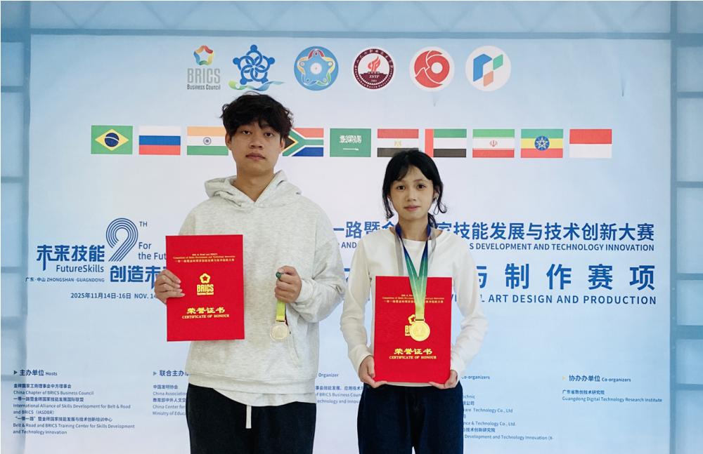 (新闻网消息 文、图/艺术学院 刘强)2025年11月14日至16日,由金砖国家工商理事会中方理事会、“一带一路”暨金砖国家技能发展国际联盟、“一带一路”暨金砖国家技能发展与技术创新培训中心主办的2025年“一带一路”暨金砖国家技能发展与技术创新大赛视觉艺术设计与制作赛项在中山火炬职业技术学院隆重举行。经过来自全国150多支队伍的激烈角逐,由我校艺术学院派出的两支队伍稳定发挥,分别荣获了一等奖与二等奖的好成绩!再次为学校赢得了荣誉。