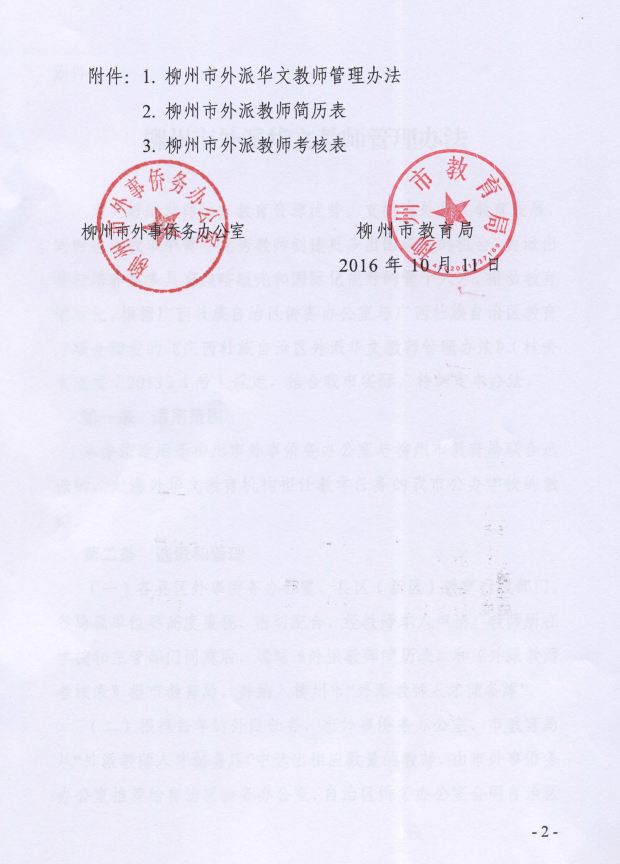 柳州市外事侨务办公室 柳州市教育局关于印发《柳州市外派华文教师管理办法》的通知( 柳外侨会字〔2016〕4 号) 来源: 发布时间:2017-08-18 15:28:00 浏览次数: 次 【字体:小 大】 分享到: 【打印正文】