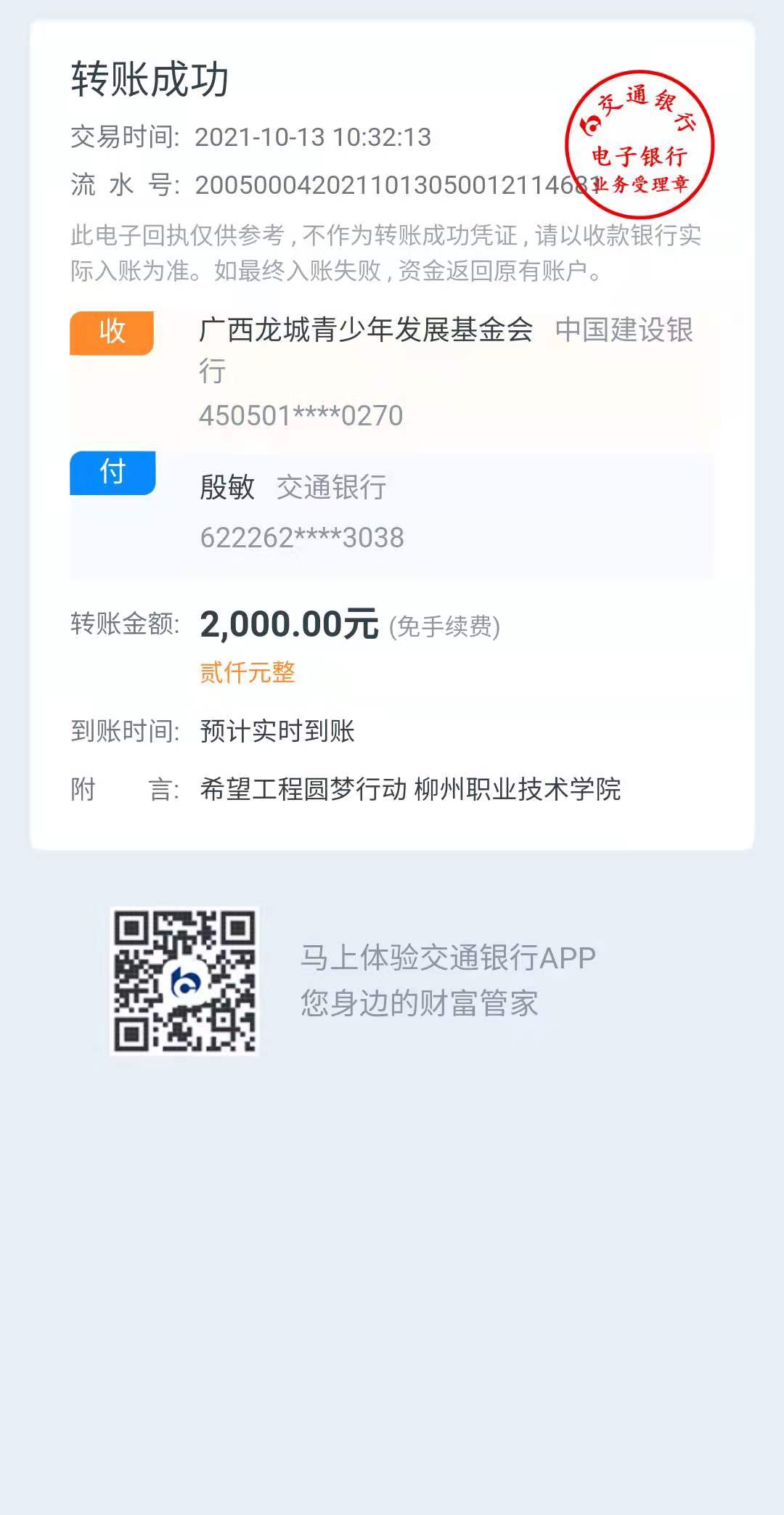 2021年9月13日,为深入践行“我为群众办实事”的初心,发挥希望工程的品牌优势,充分动员社会力量巩固拓展脱贫攻坚成果,全面推进乡村振兴,根据上级有关工作部署,学校团委在校内发布公告,倡议广大师生积极参加庆祝建党100周年“感党恩 跟党走”党史学习教育暨2021年柳州市“希望工程”公益行动(详见9月13日相应公告)。自9月13日至10月13日,共收到我校师生爱心捐赠款项2000元整。捐赠款项已于10月13日转账至广西龙城青少年发展基金会账户(转账记录见附件1)。