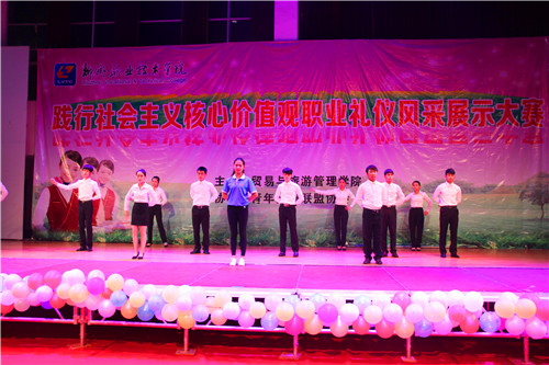 新闻网消息(文/图 贸易与旅游管理学院 吴鹏)5月7日19:30,贸易与旅游管理学院、青年金鹰联盟协会于体育馆四楼共同开展“践行社会主义核心价值观”2017职业礼仪风采展示大赛。学校党委学工部副部长崔智慧、艺术与设计学院党总支书记王慧、贸易与旅游管理学院党总支副书记陈月明、副院长谭欣出席大赛。