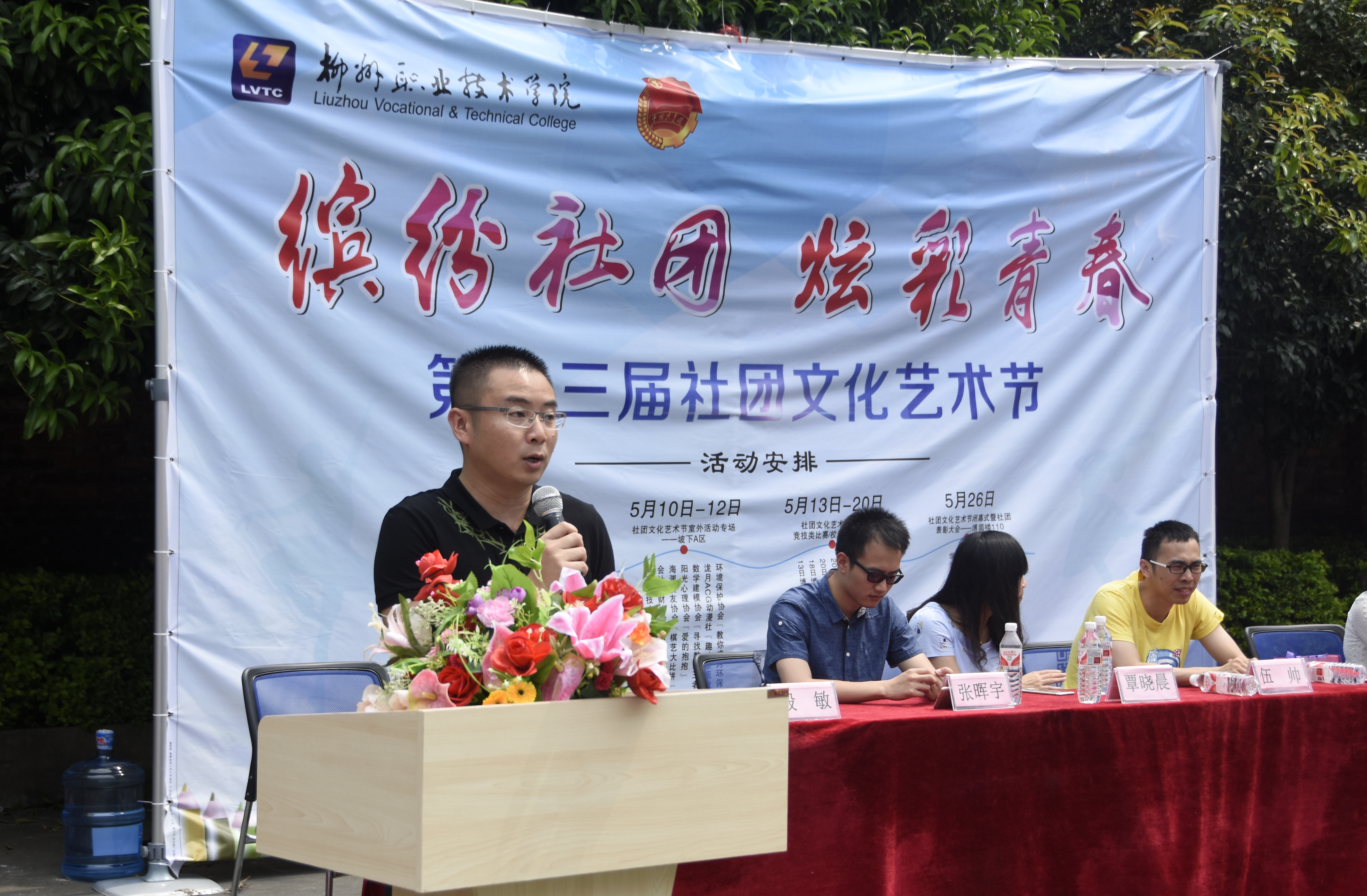 开幕式上,各个社团组成的方队一一出场亮相。轮滑社在现场帅气的秀了绕桩、花式表演,赢得阵阵掌声;书画社的同学现场大笔一挥,在诺大的白纸上留下四字——宁静致远;动漫社的同学们身着华丽的服装,赚足了观众的眼球,两位同学还跟随着动感的音乐大秀帅气的舞姿;手工艺术协会现场展出了自己精致漂亮的手工作品,赢得一致好评……所有社团入场结束后,校团委杨副书记致开幕辞,并对社团文化艺术节的一系列活动进行了介绍,同时宣布柳州职业技术学院第十三届社团文化艺术节正式开幕。