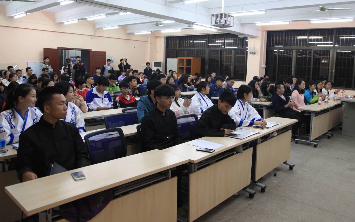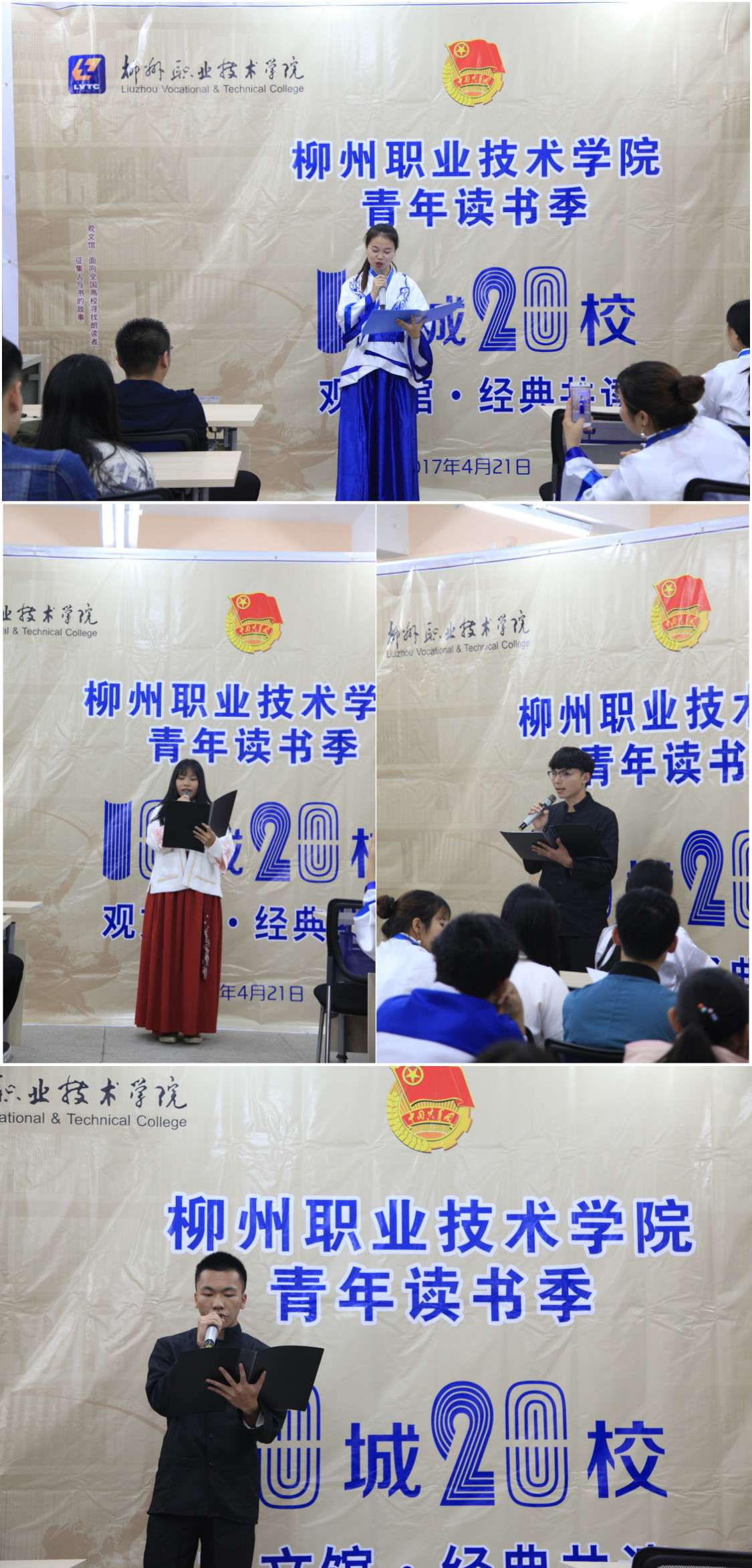 21日晚,这场由校团委举办的柳职青年读书季开幕式,在大学生活动中心一楼举行。各二级学院和各社团选送的8余名朗读者带来了中华经典诗词朗诵。校团委副书记杨小浒和各二级学院学生代表100人参加活动。