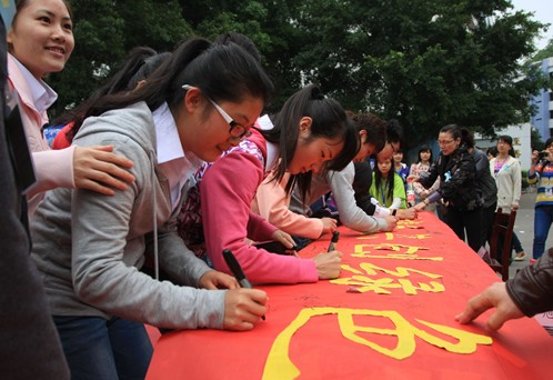 接着,我院环境?;ば峄岢ち呵烀餍脸槭?,倡导大家共同行动起来保护我们的绿色地球家园。与会领导老师、学生纷纷在环保主题横幅上签名,现场呈现了浓浓的爱护环境的氛围。
