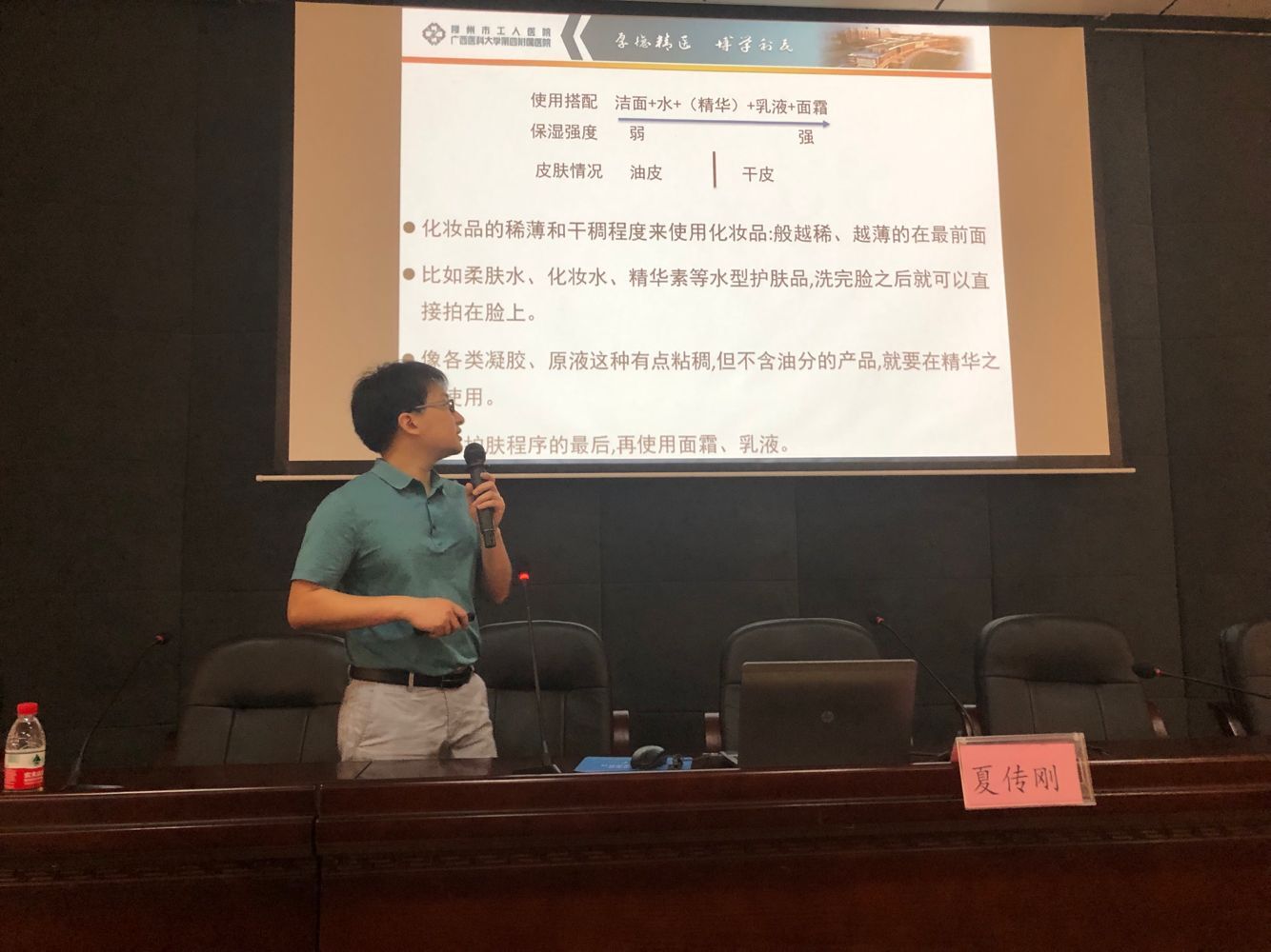 此次活动是柳州市市场监督管理局开展的“2019年全国化妆品安全科普宣传周”“化妆品科普知识进校园”活动的一部分。在讲座中,夏传刚医生为同学们介绍了皮肤的简单知识:脸部皮肤的几个主要类型:油性皮肤、干性皮肤、中性皮肤以及混合T型性皮肤四种类型,以及皮肤容易患上的几种疾病。夏传刚医生提出,油性皮肤是由于皮脂腺的分泌功能比较旺盛,面部油腻,不易清洁,同时还易出现面部相应的皮肤疾病,如痤疮,脂溢性皮炎等;中性皮肤是脸部皮肤的最佳健康状态,更大部分的人脸部皮肤是属于混合性皮肤。为了达到科学护肤,夏传刚医生针对护肤方面给与了较好的建议:1.帮助学生避开护肤盲区,科学护肤,要选择合适护肤品,并指出了一些生活中错误的护肤方法,各种皮肤类型要有针对性的护肤方案。2.一年四季都要注意防晒护肤等建议。