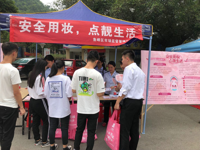 在开展讲座的同时,市场监管局的工作人员在校园内开展了护肤品相关知识的宣传活动,吸引了一拨又一拨师生的关注和围观。