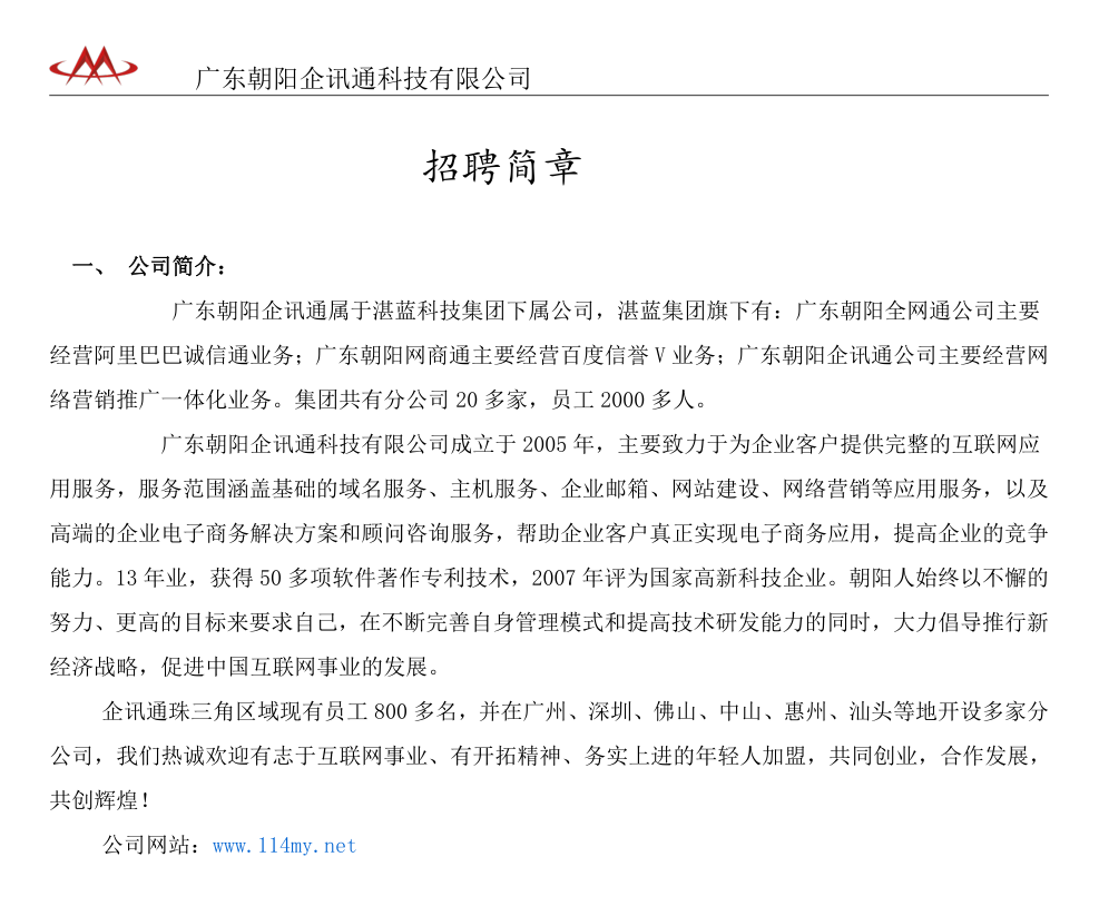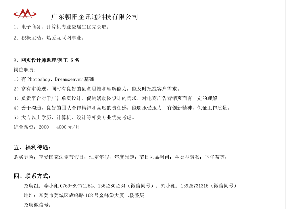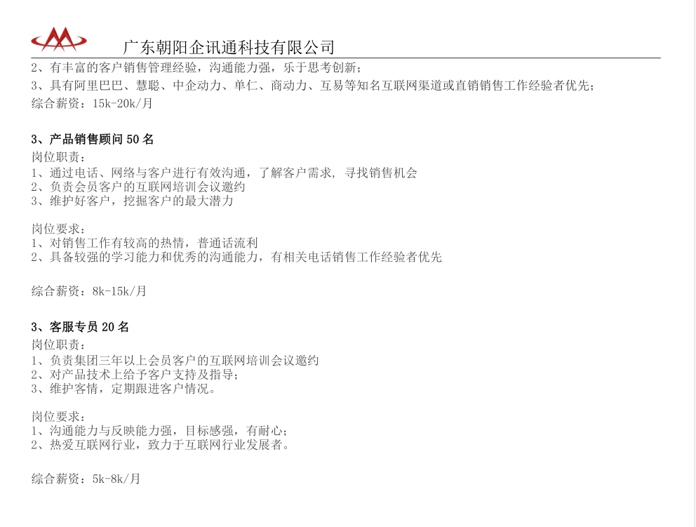 广东朝阳企讯通科技有限公司招聘简章