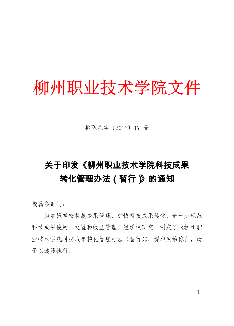 柳职院字〔2017〕17号关于印发《柳州职业技术学院科技成果转化管理办法(暂行)》的通知 来源: 发布时间:2021-12-20 09:37:28 浏览次数: 次 【字体:小 大】 终审:科研处 分享到: 【打印正文】