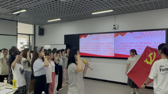 活动中,全体党员一同观看了2025年“‘青春心向党 奋斗新征程’党课开讲啦”比赛的优秀视频。视频中优秀党员的先进事迹和奋斗精神,深深感染了在场的每一位毕业生党员。随后,毕业生党员蒋云馨代表全体党员作出公开承诺:“离校不离党、退伍不褪色,以奋斗姿态书写青春答卷。”最后,在何敏华的领誓下,全体党员面向党旗,在党旗下庄严宣誓。铿锵有力的誓言在教室中回荡,彰显了毕业生党员坚定不移听党话、跟党走的信念与决心。