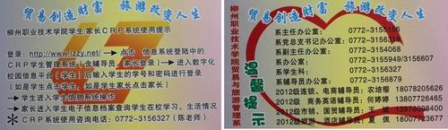 另外,该系为新生及家长精心设计制作了温馨卡片,给予温馨提示,以确保家长及新生顺利报到。卡片的一面印有系领导、各科室办公电话以及各专业辅导员的联系方式,许多学生和家长都连声称好,认为温馨卡片发送得非常及时。一位家长说:“我正愁孩子刚来学校遇到事不知道找谁,有了这张温馨卡,联系老师就方便多了,我们家长也可以随时了解孩子的情况了?!笨ㄆ牧硪幻媸恰把?家长CRP系统使用提示”,以此向新生及家长推广学院新近投入使用的CRP系统,方便他们今后的学习和生活。一张小小的卡片,透露出贸易与旅游管理系对新生无微不至的体贴和关怀,体现了该系时时为新生服务、处处为新生着想的迎新服务宗旨。(文/陈月明 朱汝群 图/陈月明)