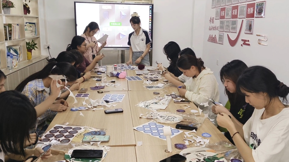 活动现场划分为四大主题区域,民族知识抢答区率先掀起热潮。参与者需在5秒内快速作答与"三月三"相关的习俗问题,答对3题即可获得通关奖励。伴随着此起彼伏的欢呼声,工作人员现场核对答案并颁发奖品,30余名同学成功通关。民族美食体验区陈列着五色糯米饭,天然植物染制的饭团色泽鲜艳,吸引同学们拍照留念后细细品尝。非遗制作区内,朋辈导师黄静现场教授绣球制作方法,学员们专注描摹壮锦花纹,将彩纸剪裁成壮锦形状,并用胶水层层堆叠,形成一个个精美的绣球。在民族文化体验的语言互动区则上演着跨文化交流,壮族志愿者教学"蒙好"(你好)、瑶家姑娘传授"呀咧"(谢谢),朋辈导师苏琳现场表演并教授桂林彩调,同学们纷纷被婉转的歌声吸引,感兴趣的同学更是投入到桂林彩调的学习中,现学现用引发阵阵掌声。