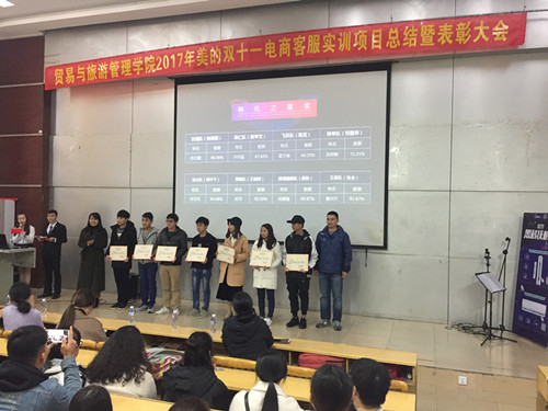 1125日下午1400,贸易与旅游管理学院在博闻楼110教室举行了2017年美的集团“双十一”电商客服实训项目总结表彰大会。出席此次会议的有学生科长夏佩、美的集团项目经理赵杨、电子商务团队负责人胡志仁、连锁经营管理专业团队负责人王晓娟、辅导员李静宜、覃慧川以及美的“双十一”项目客服督导和参加此次项目的2016级电子商务、连锁经营管理、网络营销三个专业共计244名学生。