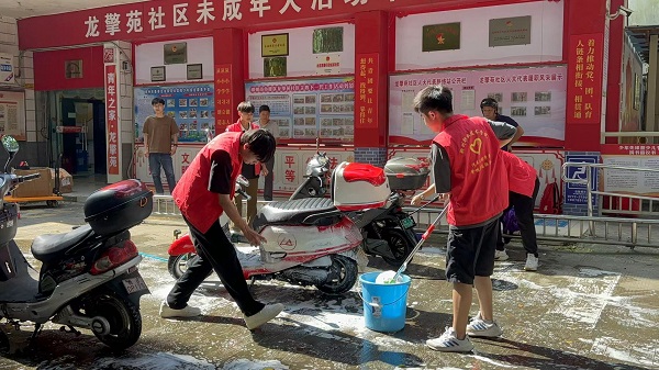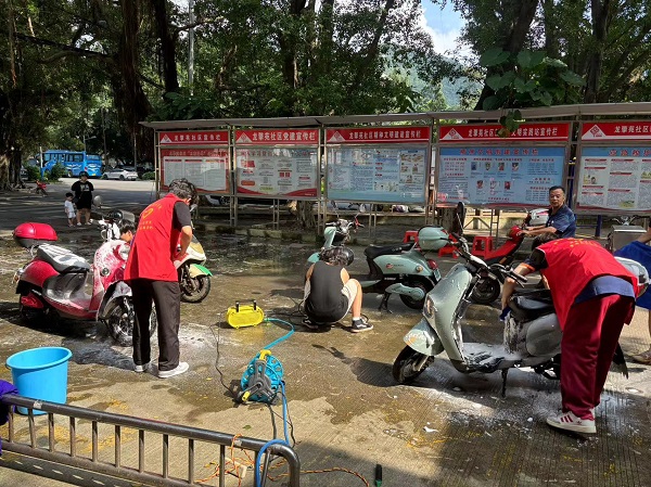 在社区,入党积极分子黄元满同学向社区居民宣传了习近平新时代中国特色社会主义思想和党的二十大精神,讲了我国的发展成就、当下形势任务,推进理论宣传进基层。接着,志愿者们在余姝源老师、冯春林老师的指导下,为社区居民的小汽车、电动车进行免费清洗美容服务,解决社区居民洗车不便等问题,居民们纷纷为志愿者们点赞,对洗车服务表示十分满意。此外,志愿者们还清理了道路、绿化带上的垃圾,为社区居民们提供了一个美丽、干净的生活环境,志愿者们的热情服务,也得到龙擎苑社区居民的一致好评。