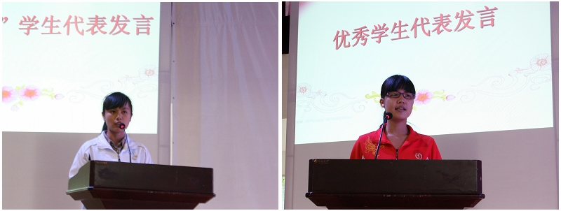 来自财经与物流管理系2011级会计电算化1班的学生吴桂英,获得了2013年“自治区优秀学生干部”荣誉称号,作为优秀学生代表上台发言时她说:“面对获奖,我除了些许紧张,更多的是一份坦然、感激,感谢多年来校领导和老师们的培养,我将一如既往地刻苦钻研,保持优良成绩;继续踏实工作,尽职尽责?!?br> 阳副书记向辛勤在一线的辅导员和全体同学表示亲切慰问,向受表彰的同学和班级表示热烈祝贺。他说,2012—2013学年度,我院涌现出了一批凝聚力强、班风学风良好的班集体以及学习刻苦、成绩突出的优秀学生,他们所取得的成绩,赢得了广大师生的认可和赞誉,得到了学院和上级的肯定。今天召开表彰大会,旨在表彰先进及总结班级建设中的经验,将有效地促进学风校风建设,营造“学习先进、争创先进” 的良好氛围。今年,在国家、自治区出台的“国家奖学金”、“国家励志奖学金”、“自治区人民政府奖学金”等一系列奖励、资助政策的基础上,学院增加了“优秀学业奖学金”奖项,扩大了三好学生、优秀学生干部的获奖范围,提高了各级先进班集体的奖金。与往年相比,仅学生评优一项,学院就比往年增加40多万元用于表彰奖励先进班级和优秀学生个人。各级奖励、资助政策的出台和实施,有效地解决了同学们的学费、生活费等实际问题。只要同学们珍惜当前来之不易的学习机会,充分利用学院各种先进的学习资源,发奋图强,就一定能学到一技之长,将来立足社会,报答家人、报效祖国!