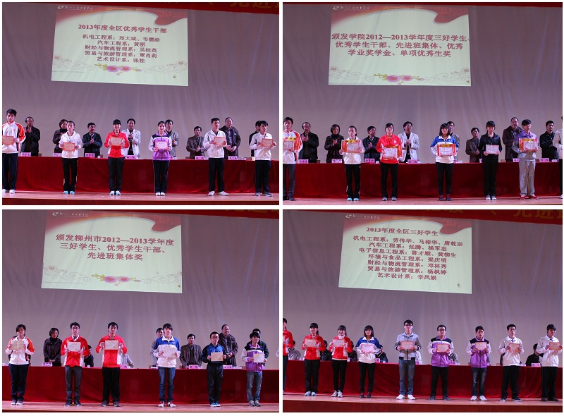 在庄严肃穆的国歌声中,大会拉开了序幕。学生工作处处长唐冬雷宣读获得院级、市级和自治区级先进集体和先进个人等各类奖项的表彰决定。2012—2013学年度,我院10个班集体获得学院“十佳班级”荣誉称号;22个班级荣获学院先进班集体、702名学生获得学院三好学生、402名学生获得学院优秀学生干部、1028名学生获得学院优秀学业奖学金、27名学生获得学院单项优秀生;203名柳职学子被评为柳州市三好学生、396名学生被评为柳州市优秀学生干部、27个班级被评为柳州市先进班集体;另外,我院劳传华、马彬华、唐乾宗、张腾、杨军忠、陈才顺、黄柳生、梁庆明、邓林秀、杨枫婷、辛凤娱等11名同学被评为2013年全区三好学生,郑大斌、韦儒添、黄丽、吴桂英、覃肖莉、张桂等6名同学被评为2013年全区优秀学生干部,机电工程系2011级机电设备维修与管理2班(辅导员:韦伟)、汽车工程系2011级汽车技术服务与营销2班(辅导员:伍帅)、贸易与旅游管理系2011级电子商务班(辅导员:农培樱)、艺术设计系2011级建筑装饰工程技术1班(辅导员:朱江)等4个班级被评为2013年全区先进班集体。刘关妙等320名学生获得高校2012-2013学年度国家励志奖学金,吴桂英等66名学生获得高校2013-2014学年度自治区人民政府奖学金。阳旭副书记和各系党总支书记为获得各种荣誉称号的个人和集体代表颁发奖状和绶带。