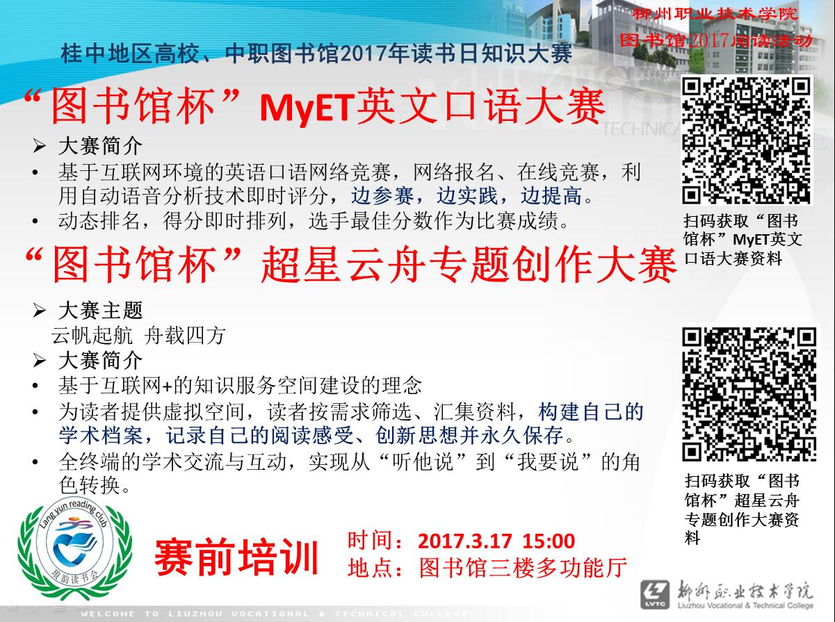 图书馆拟举办2017年“读书日”知识大赛赛前培训 来源: 发布时间:2017-03-15 10:55:00 浏览次数: 次 【字体:小 大】 欢迎全校师生参加。 点击获取: “读书日”知识大赛内容和资料 分享到: 【打印正文】
