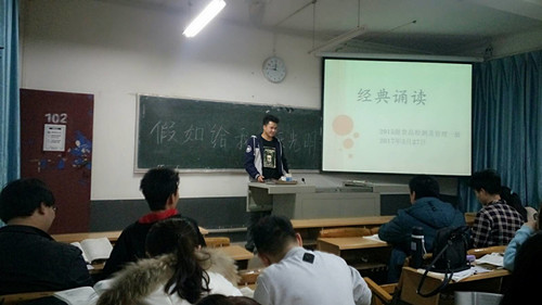 3月27日,在文华楼102教室,2015级食品检测及管理一班开始了第一次经典诵读活动。班长韦宏诚诵读了海伦凯勒的《假如给我三天光明》,希望同学们坚强面对所有的不如意,坚信只有不放弃,自强不息,平凡的人生才会绽放出不平凡的生命光彩。4月6日,团支书刘永倩诵读海明威的作品《老人与?!?,愿每个人都能练就精湛的技艺,顽强战斗、永不言败。