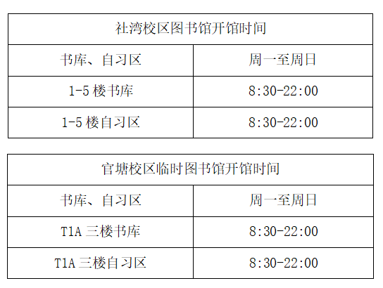 关于调整图书馆开馆时间的通知 来源: 发布时间:2025-12-01 19:37:15 浏览次数: 次 【字体:小 大】 全校师生:为进一步优化服务效能,更好地满足广大师生的学习与阅读需求,自2025年12月1日起图书馆开馆时间进行调整,具体安排如下: 此次调整旨在为大家提供更长的服务时间与更便利的学习环境,望周知并相互转告。感谢各位师生长期以来对图书馆工作的支持与理解!特此通知。图书馆2025年12月1日 一审:图书馆一审 终审:图书馆三审 分享到: 【打印正文】