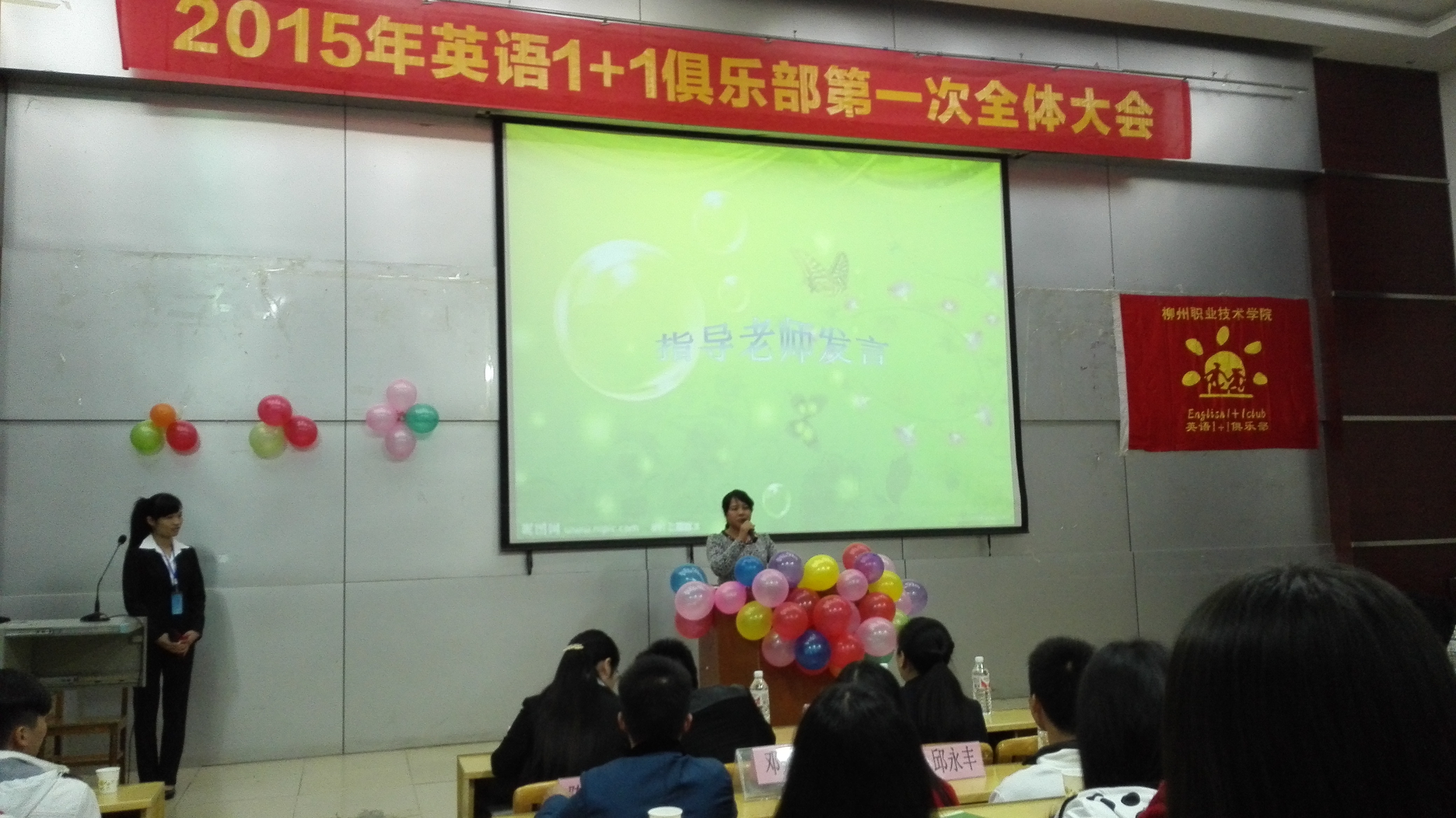 新闻网消息(通讯员/公共基础部 欧阳锦屏 英语1+1俱乐部 唐影妮 摄影/莫启福)11月1日晚上7:30—9:30,英语1+1俱乐部在学院本部博闻楼110教室召开“英语1+1俱乐部第八届第一次全体大会”,大会邀请到了俱乐部的指导老师欧阳锦屏和候俊老师以及俱乐部的第一届会长李诚、第六届会长姚国威、第七届会长梁天等学长为本次大会的嘉宾,俱乐部第八届理事和2015级两百多名新会员。