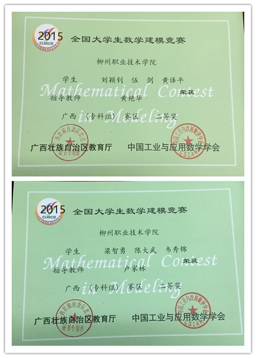 新闻网消息(通讯员/公共基础部 韦碧鹏)近日,从广西教育厅获悉,我院学子在2015年全国大学数学建模竞赛中荣获佳绩:五个参赛队中,一个队获国家二等奖兼广西赛区一等奖,两个队获广西赛区二等奖,余下两个队获成功参赛奖,我院国家奖答卷入选广西赛区优秀论文集。