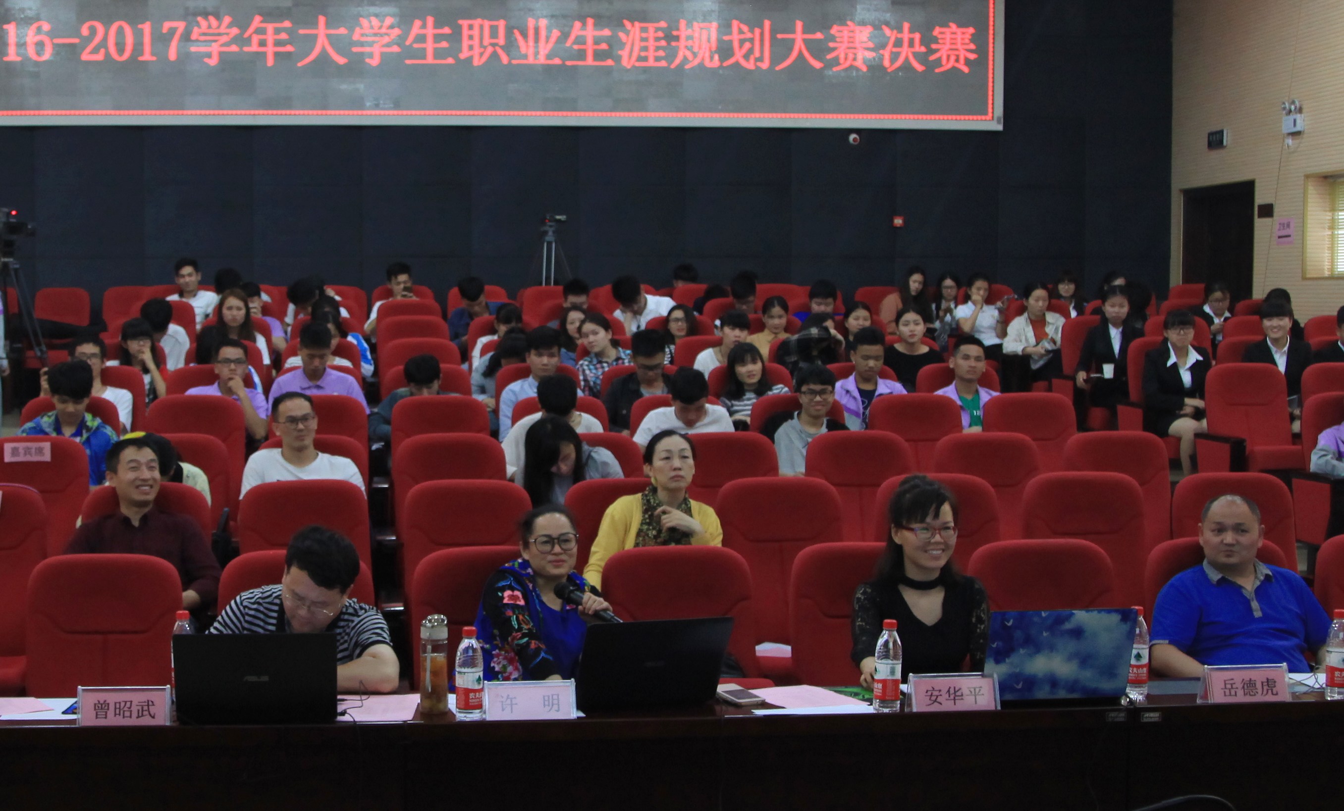新闻网消息(文/公共基础部大学生KAB创业俱乐部 蓝必龙 图/党委宣传部 朱敬民、韦仁祖)5月19日下午,由学生工作处、公共基础部、思政部主办、大学生KAB创业俱乐部协办的“规划未来,放飞梦想”2016-2017学年通用技能大赛大学生职业生涯规划比赛校级总决赛在行政楼100报告厅举行。公共基础部心理与就业系列课程教学团队的许明教授等五位老师担任评委?;疃固乇鹧肓烁碧兜餮性薄⒃揖房纬獭毒鸵涤氪匆怠废盗锌纬谈涸鹑苏畔杞淌诘H蔚闫兰伪?,各二级学院、校就业处等单位、部门领导、老师及100多名学生观看了比赛。