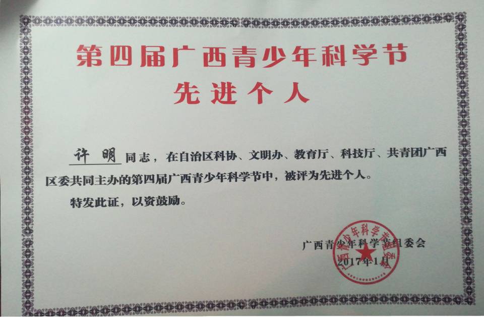 喜讯:我校教师在第四届广西青少年科学节中被评为先进个人