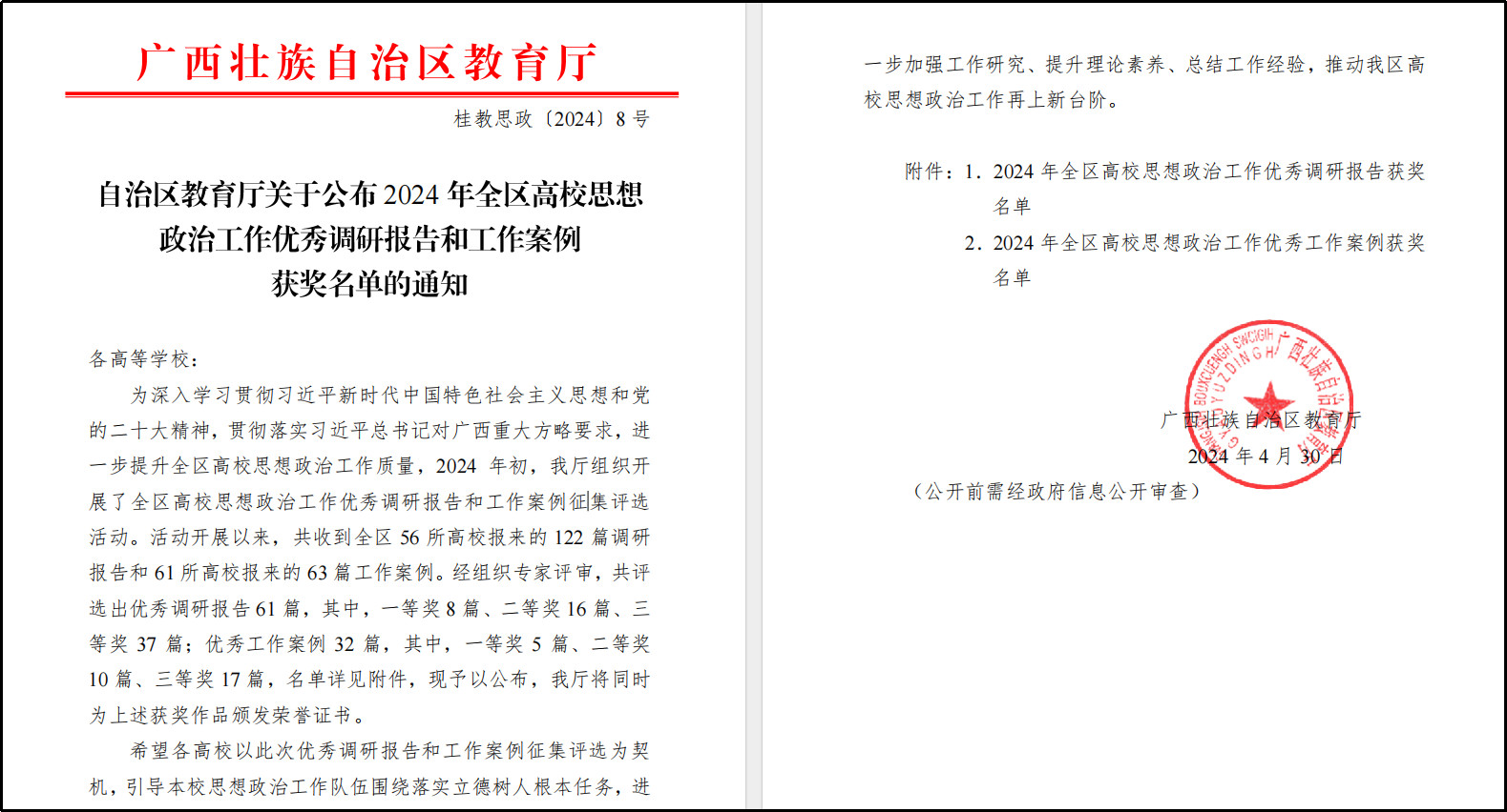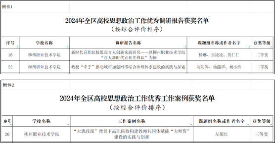 新闻网消息(文、图/党委宣传部 莫仁仁) 近日,自治区教育厅公布了2024 年全区高校思想政治工作优秀调研报告和工作案例获奖名单,我校报送的三篇作品均获奖。其中,调研报告《新时代高职院校思政育人创新实践研究——以柳州职业技术学院“百人新时代宣传先锋队”为例》《政?!扒J帧蓖贫鞘屑忧客缱酆现卫硖逑到ㄉ璧氖导胩剿鳌啡倩穸冉保ぷ靼咐丁按笏颊巍北尘跋赂咧霸盒9菇ń淌餐甯衬堋按笫ψ省苯ㄉ璧氖导氪葱隆啡倩袢冉?。