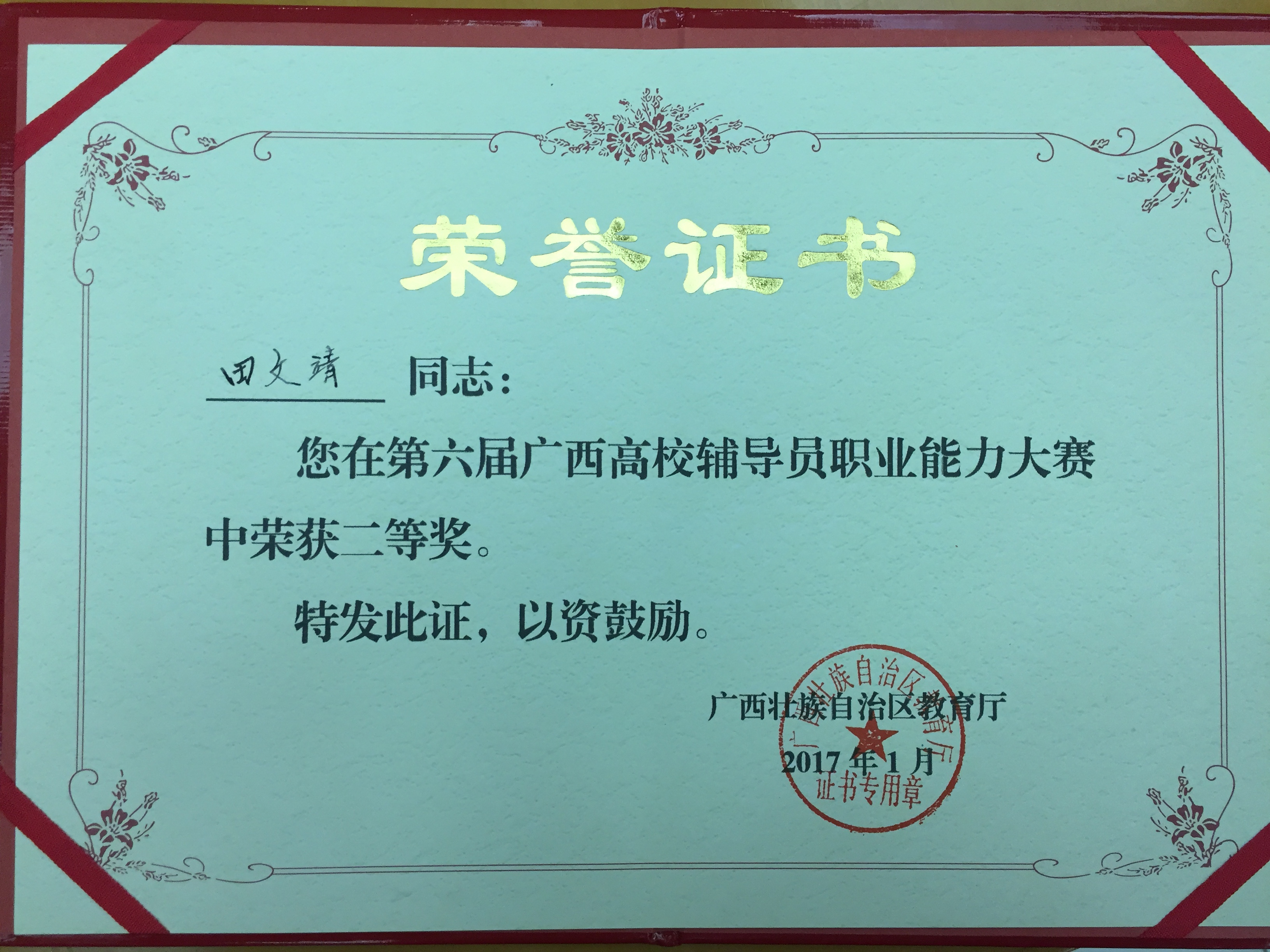 新闻网消息(文/学生工作处 郑柳萍 图/机电工程学院 丘小维)2017年1月5日至6日,由自治区高校工委、教育厅主办的第六届广西高校辅导员职业能力大赛在广西大学举行,来自全区64所高校的93名辅导员参与大赛比拼。我校机电工程学院辅导员田文靖凭着扎实的学识、过硬的技能和优秀的职业素养荣获了大赛二等奖。