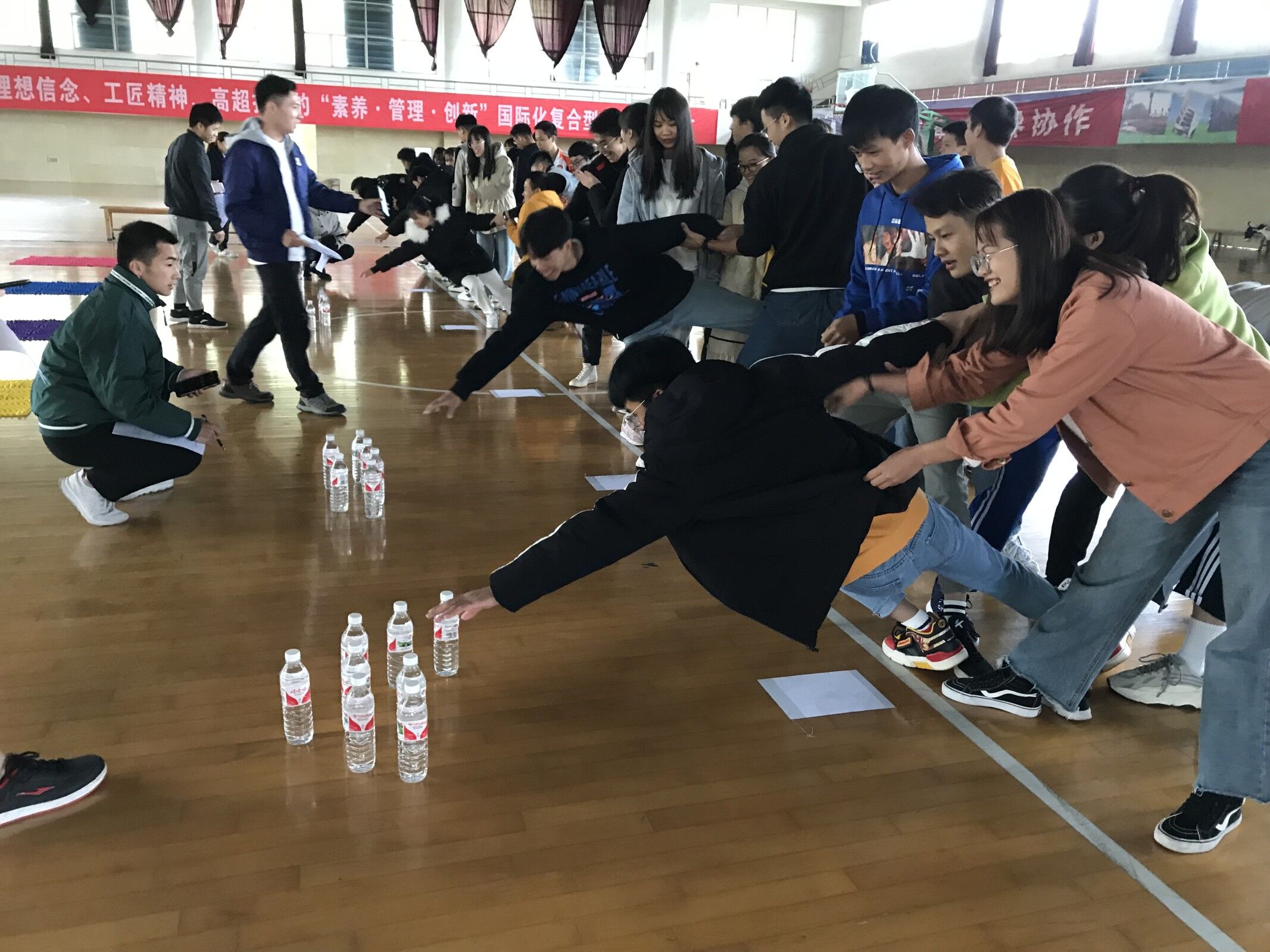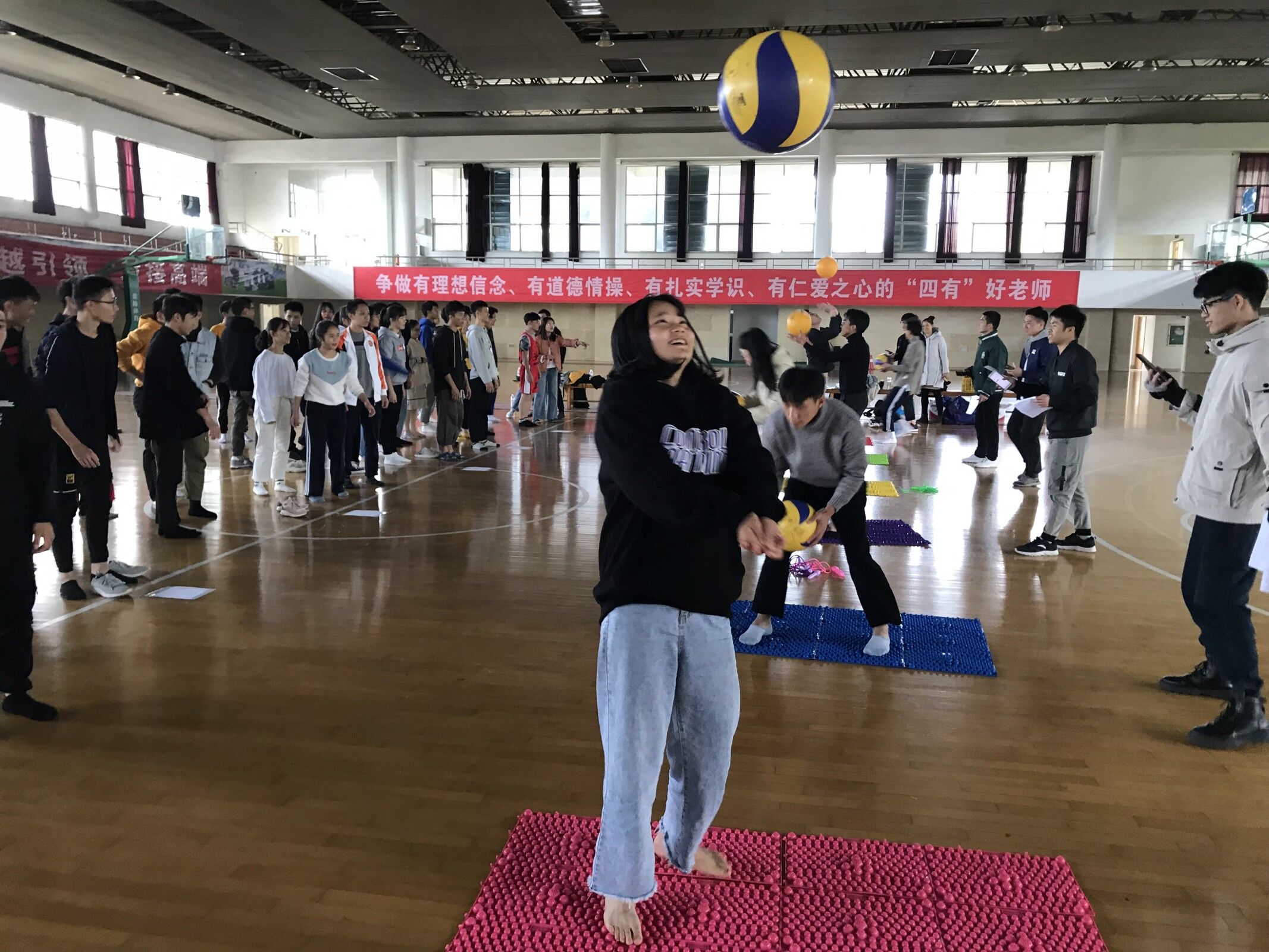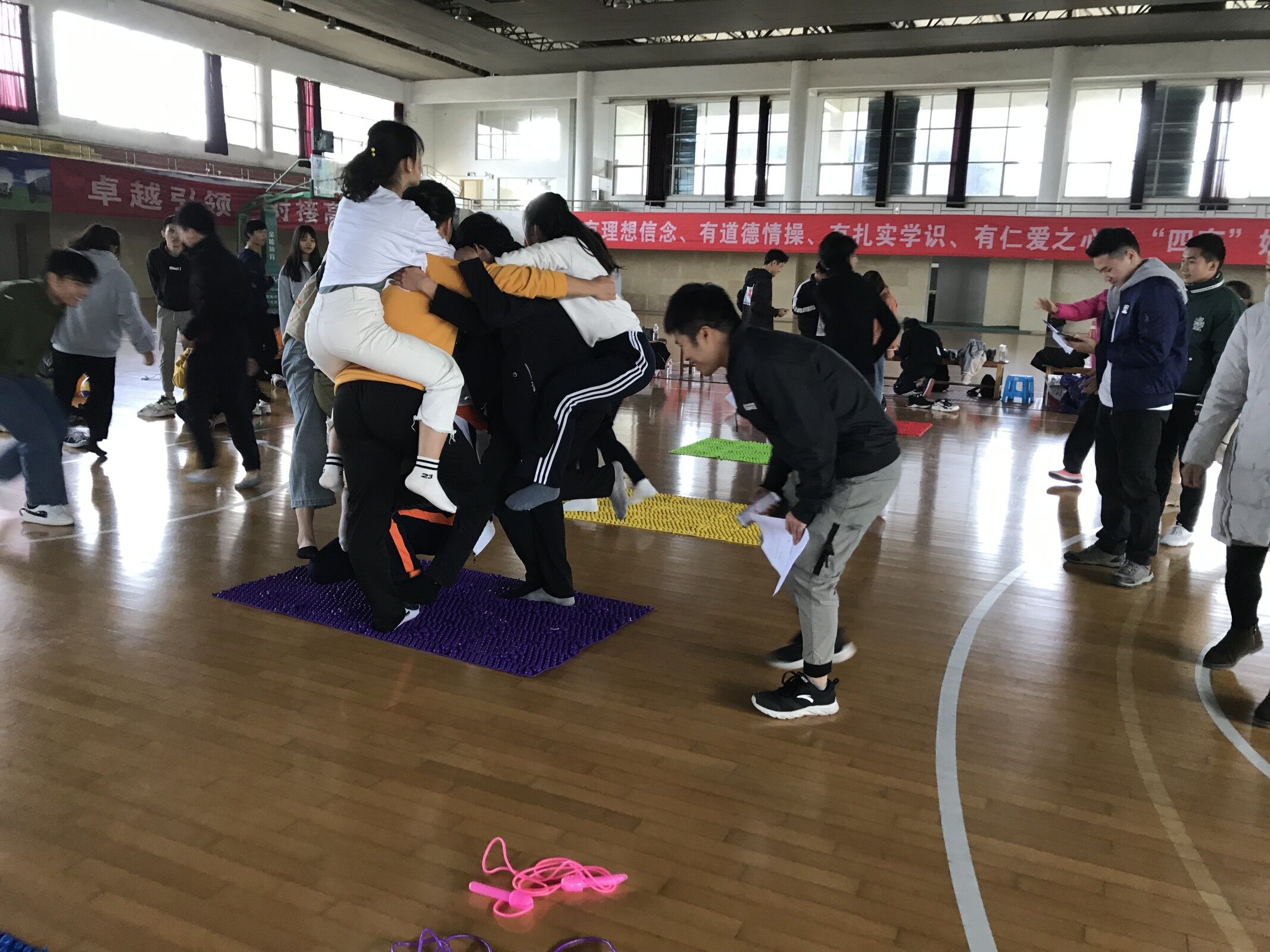 (文、图/学生工作处 郑柳萍)为进一步增强我校综合服务中心队员们的团队协作能力,搭建彼此沟通交流平台, 11月29日下午1点30分,在学校体育馆四楼举办了两校区素质拓展活动。共有80多名值班员和老师参加了活动。