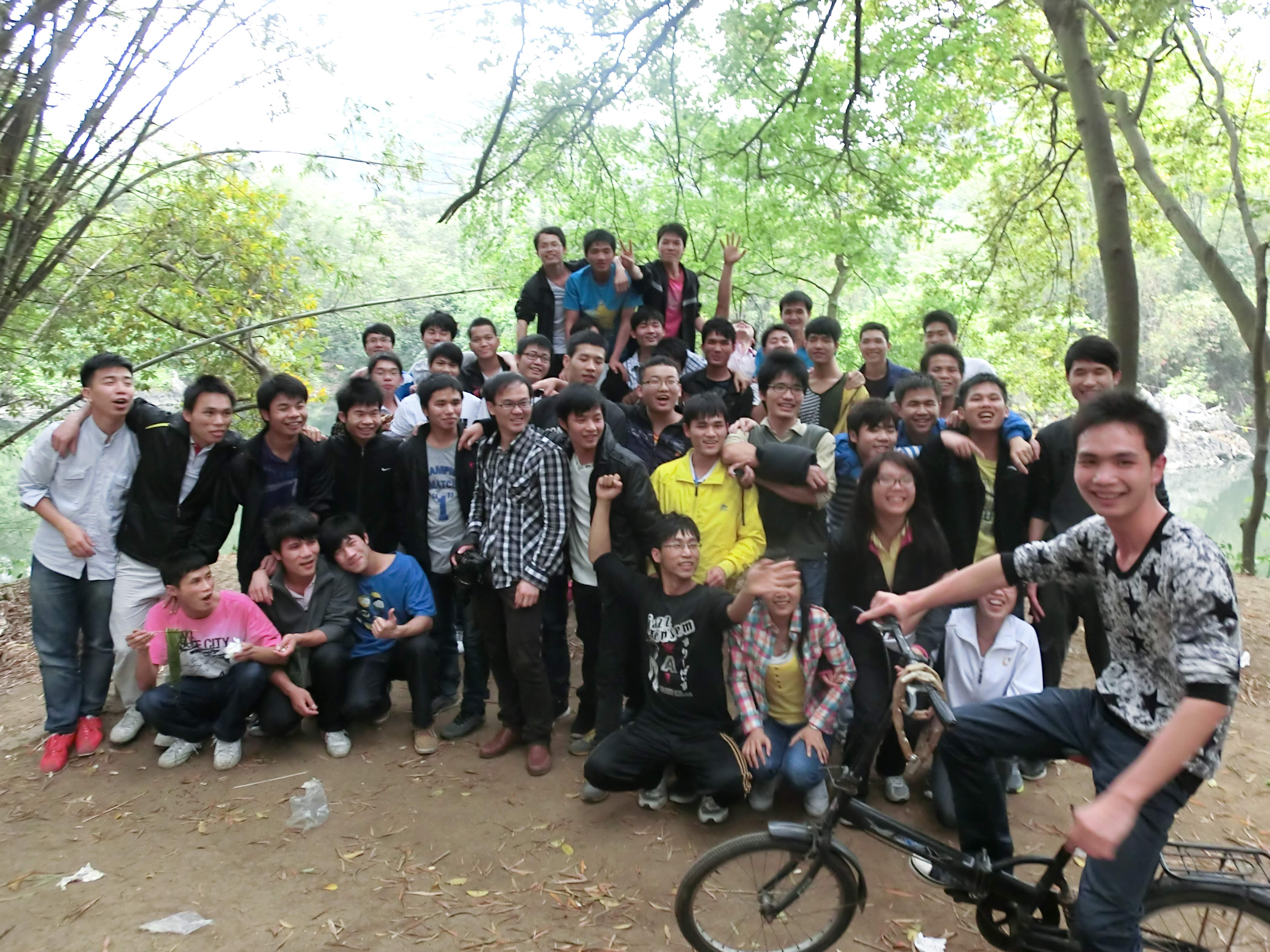 韦伟老师(中,着格子衣戴眼镜者)与二班同学在一起