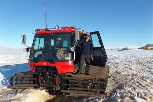 在中山站,为了下站科考物资能早日到达,他持续半个月每天都超过12个小时的卸载工作,虽然极昼的环境让人感觉不到困意,但体力的大量消耗让他感到不适。为了确保每台设备都能无故障运行,他每天都要比站里的其它队员早起床去检查、维护。顶着寒风踏着冰雪一台接着一台的启动机器、排查油水、填写记录……吃过早饭后就守在电话旁一边研究各种设备的维修说明,一边等着处理抛锚设备的应急信息。因为极端的环境条件,设备偶发的故障也不少,徒步10几公里背着工具包外出执行维修任务的次数虽然不多,但是每次出去都是汗流浃背!经过一个月的精心维护,站里设备的故障越来越少了,闲不住的他又主动承担起为站里50余名队员打水的任务,每隔三天他就会开着雪地车,拉上水罐,去8公里外的内陆湖补充站里人员的生活用水。无论是中山站机械车辆的管理、操作和维修保养,还是建立和管理机械设备维修档案,他都要求自己做到精益求精,因为他深知这是柳工赋予它的职责,他要用实际行动为柳工产品最终登陆南极冰川做好铺垫,不辜负大家的殷切期望。