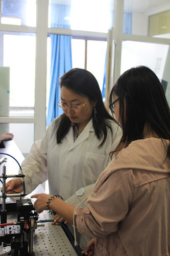 图为于巧玲(左)带着她的学生在做试验(受访者供图)