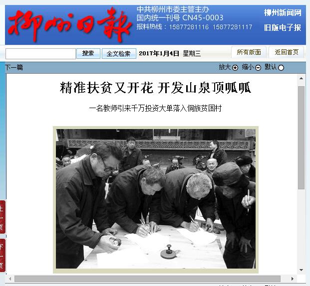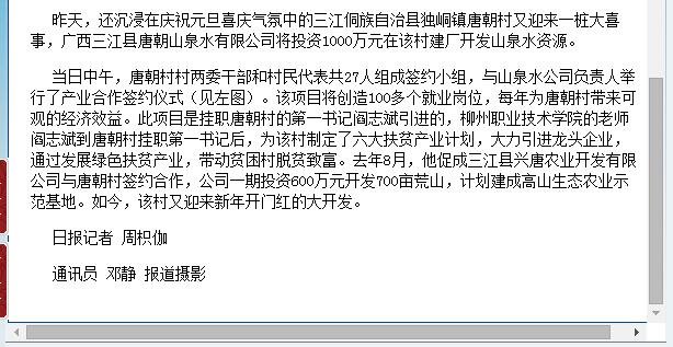 2017年1月4日,柳州日报在第4版,以“精准扶贫又开花 开发山泉顶呱呱 一名教师引来千万投资大单落入侗族贫困村”为题,刊发在唐朝村挂职的第一书记的我校教师阎志斌引进广西三江县唐朝山泉水有限公司投资1000万元在该村建厂开发山泉水资源的新闻。详情可点击http://szb.lznews.gov.cn/lzrb/html/2017-01/04/content_12735.htm(截图:唐艳)