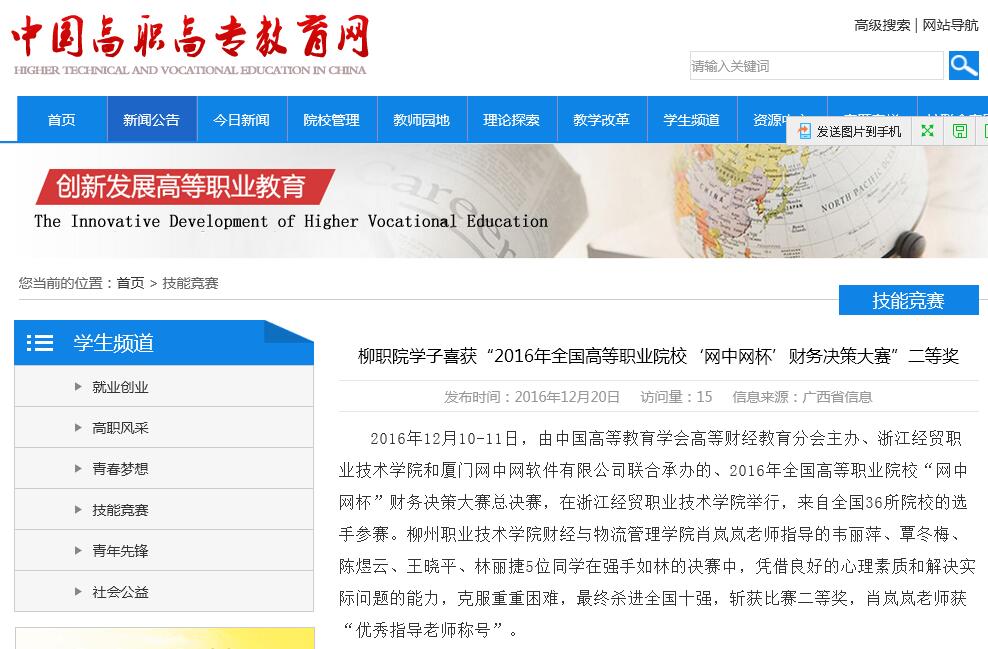 2016年12月20日,中国高职高专网在学生频道刊发了我校学子参加技能竞赛喜获“2016年全国高等职业院校‘网中网杯’财务决策大赛”二等奖的新闻。(截图:石玉丹)详情请点击:http://www.tech.net.cn/web/articleview.aspx?id=20161220120422006&cata_id=N030