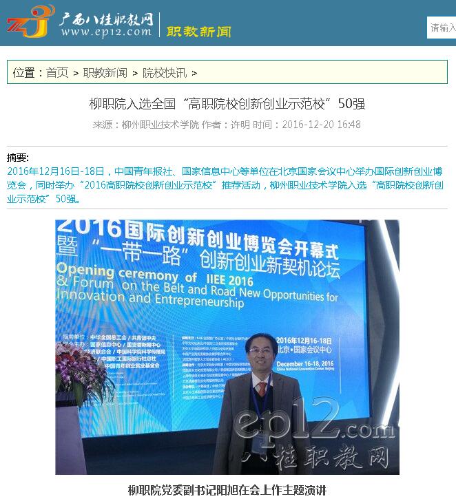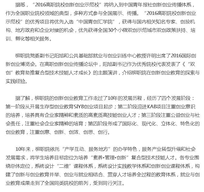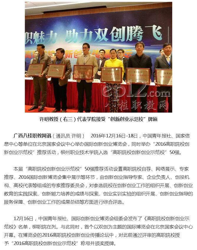 【广西八桂职教网】柳职院入选全国“高职院校创新创业示范?!?0强
