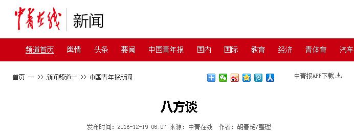 2016年12月19日,中青在线在新闻频道-中国青年报新闻栏目,以“八方谈”为题,刊发我校领导参加在北京国家会议中心举办的国际创新创业博览会及“2016高职院校创新创业示范?!被疃?。在高职创新创业传播论坛中,作为优秀院校代表,我校党委副书记阳旭发表《“双创”教育助推复合型技术技能人才成长》的主题演讲,介绍我校在创新创业教育的探索与实践经验。(截图:石玉丹)详情请点击:http://article.cyol.com/news/content/2016-12/19/content_14988007.htm