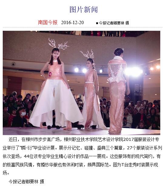 2016年12月20日,南国今报在第27版的图片新闻里,刊发我校艺术设计学院2017届服装设计专业举行“瞬·衍”毕业设计展的新闻。详情可点击http://epaper.gxnews.com.cn/ngjb/html/2016-12/20/content_2810287.htm(截图:唐艳)