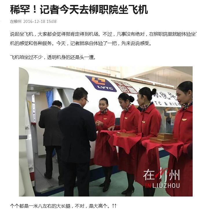 2016年12月18日,在柳州APP以“稀罕!记者今天去柳职院坐飞机”为题,发布我?;泻窖г汗遗瞥闪⒌男挛拧?/font>