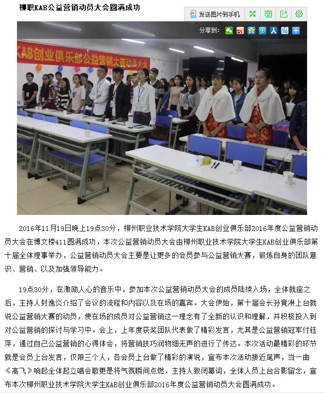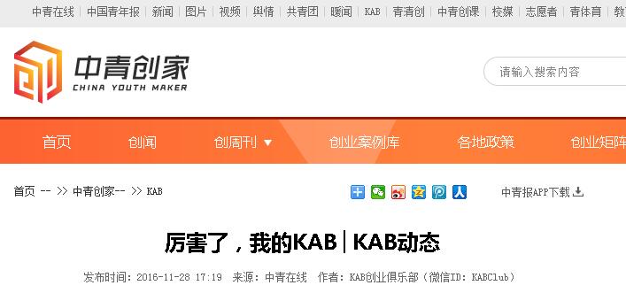 2016年11月28日,中青在线网在中青创家-KAB栏目中,以“厉害了,我的KAB”为题,刊发我校KAB创业俱乐部学子开展市场营销动员会的新闻。详情点击:http://article.cyol.com/chuangjia/content/2016-11/28/content_14763076.htm (截图:石玉丹)
