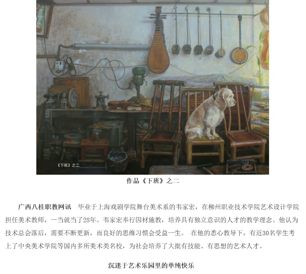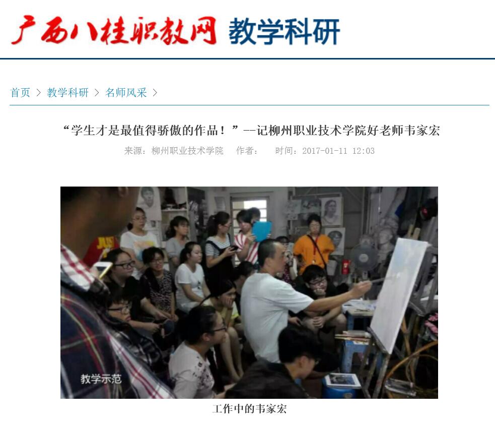 2016年1月11日,广西八桂职教网在教学科研-名师风采栏目,刊发我校艺术设计学院好老师、画家韦家宏的人物专访。(截图:石玉丹)详情点击:http://www.ep12.com/a/schoolstyle/eg/2017/0111/44527.html